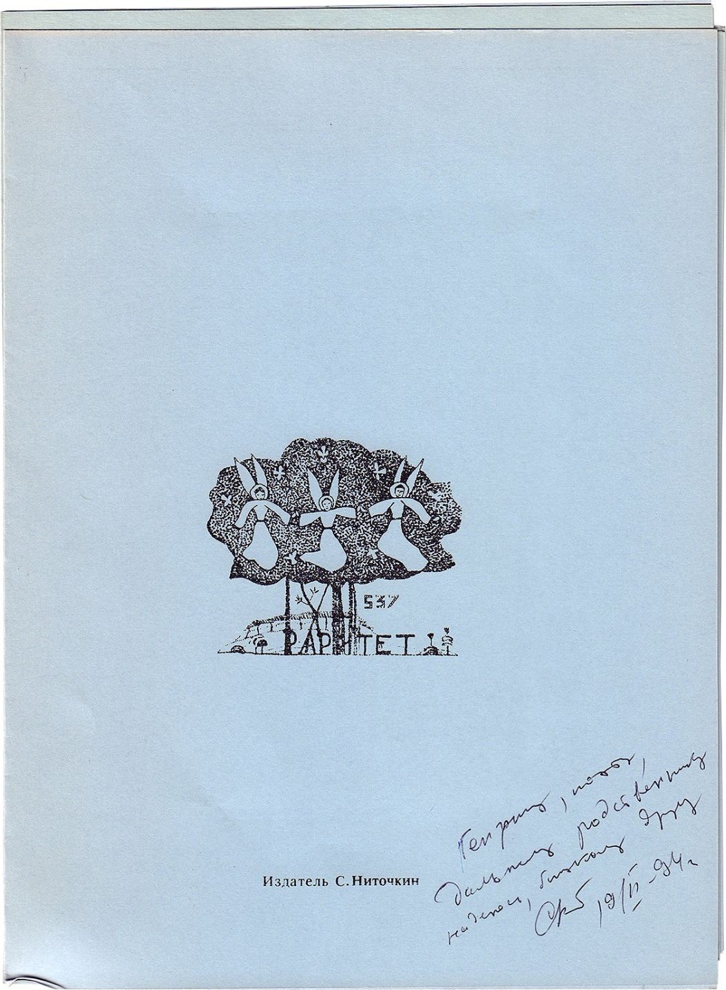 Дарственная надпись рукой издателя Сергея Ниточкина на странице марки издательства: «Генриху, поэту, / дальнему родственнику / надеюсь, близкому другу / <автограф> / 19/II - 94г». Адресат автографа — Генрих Вениаминович Сапгир (1928-1999), поэт, прозаик, сценарист, переводчик. Один из создателей (вместе с И. Холиным) так называемой «барачной поэзии». С середины 1960-х годов публиковался на Западе. Известен в СССР как детский поэт, драматург и сценарист. Участник альманаха «Метрополь», составитель поэтического раздела антологии «Самиздат века». Михаил Александрович Хусид (1947 - 2023) — режиссёр, драматург, основатель театральной школы, реформатор советского театра кукол. Михаил Хусид совместно с Гениром Сапгиром создал несколько пьес для театра кукол.