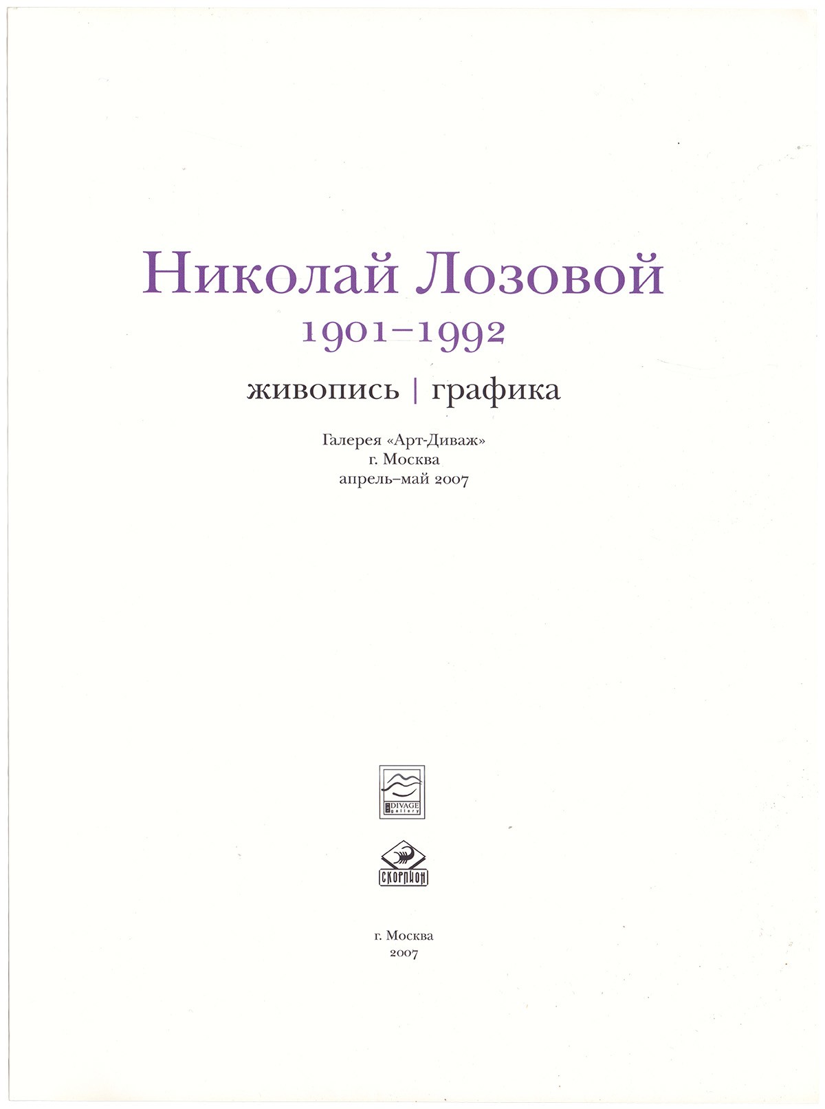 В иллюстрированной издательской обложке. Каталог выставки Николая Григорьевича Лозового, проходившей в Москве, в галерее `Арт-Диваж` в апреле-мае 2007 г. Книга содержит 112 репродукций работ художника, фрагменты его воспоминаний о П. Филонове и К. Малевиче. Статьи сопровождаются фотографиями из архива художника и репродукциями его рукописей. Каталог предваряют вступительные статьи искусствоведов А. Кузнецова и И. А. Прониной, а также биография художника авторства И. А. Вакар.