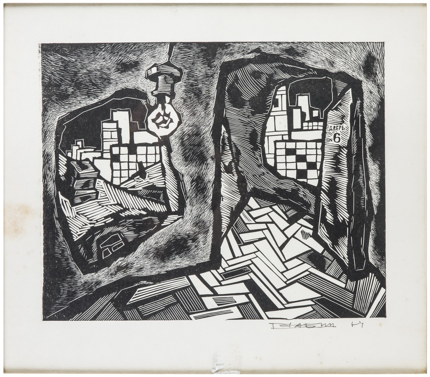 Оскар Яковлевич Рабин (1928-2018) — художник-нонконформист, график. В 1943 году занимался в кружке Дома пионеров у Е.Л. Кропивницкого, в 1950-х гг. в его мастерской. «В каком-то объявлении я прочел, что в Доме пионеров открывается живописная студия. Пошел туда. Узнал, что студией руководит Евгений Леонидович Кропивницкий и что записалось туда всего три ученика. Столько же записалось и в поэтическую секцию, которой руководил тоже Евгений Леонидович» — вспоминал художник. Стал одним из активных участников Лианозовской группы. В 1950 году женился на Валентине Кропивницкой. В 1957 году работа Рабина «Ландыши» была отмечены серебряной медалью выставки Московского фестиваля молодежи и студентов. В 1958 начался «барачный» период творчества, принесший художнику мировую известность. Один из организаторов и участников «бульдозерной» выставки (1974). В 1978 г. во время санкционированной советскими органами поездки во Францию был лишен гражданства. Жил и работал в Париже.