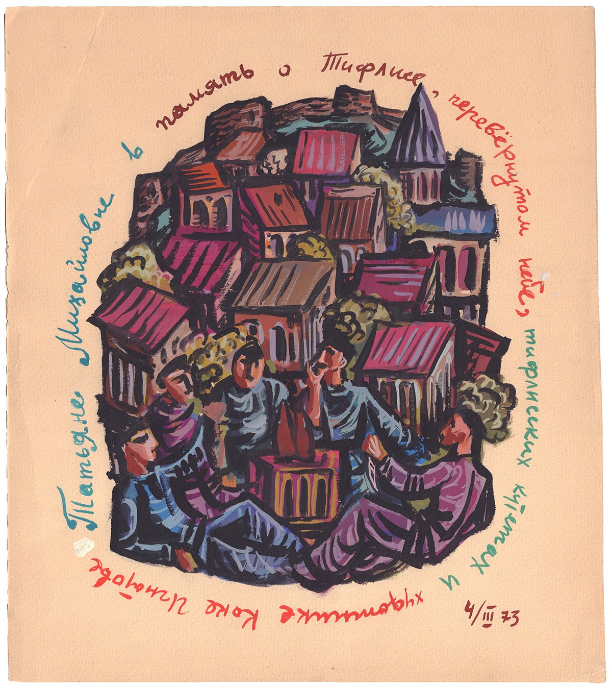 Вокруг изображения дарственная надпись художника, адресованная Т.М. Вечесловой: «Татьяне Михайловне в память о Тифлисе, перевернутом небе, тифлисских кутежах и художнике Коке Игнатове / 4/ III 73».