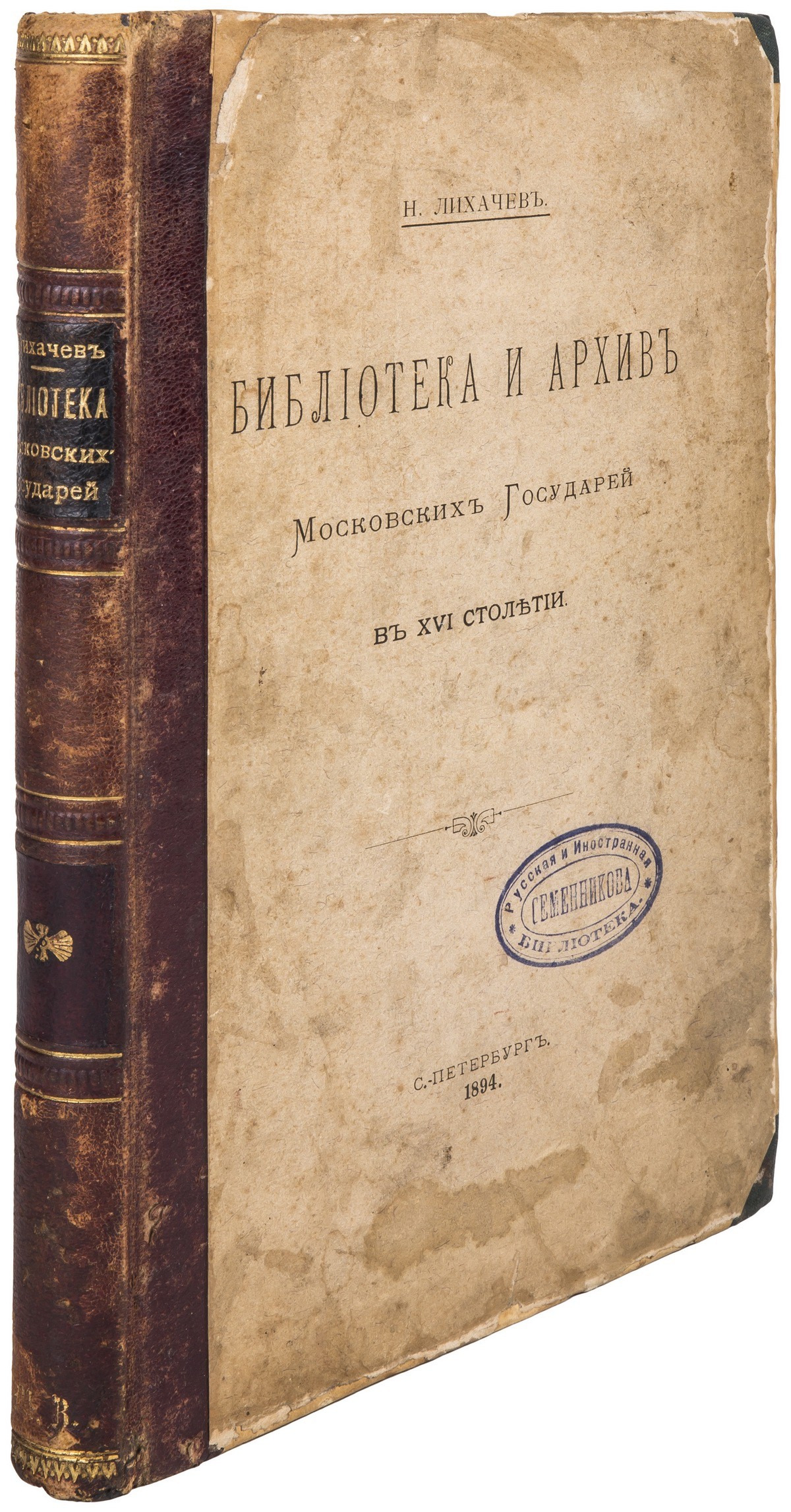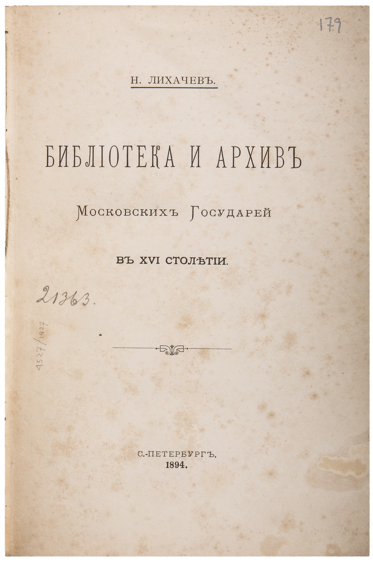 Николай Петрович Лихачев (1862-1936) — выдающийся русский историк, археолог и палеограф. Его исследование посвящено библиотеке Ивана Грозного, автор скрупулезно анализирует все доступные зарубежные и отечественные свидетельства о библиотеке московских царей и дает оценку их исторической достоверности. Ульянинский, № 2969 ( тираж 400 экз.).