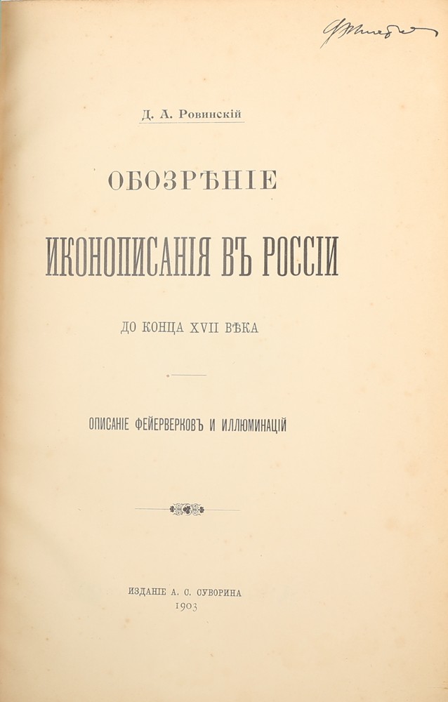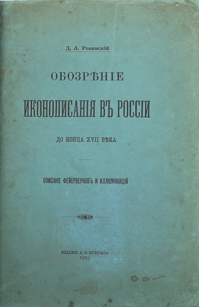 Дмитрий Александрович Ровинский (1824–1895) – русский юрист, историк искусства и автор-составитель множества изданий по иконописи, гравюре и проч. Его труд, посвященный истории иконописи в России в XI–XVII веках, впервые был напечатан в 1856 году в VIII томе Записок Археологического Общества. После смерти Ровинского «Обозрение...» вышло в полном виде, вместе с трудом о фейерверках из архива исследователя. В издании помещен самый известный портрет Ровинского – работы Ивана Петровича Пожалостина (1837–1909), русского художника, гравера, мастера-портретиста.