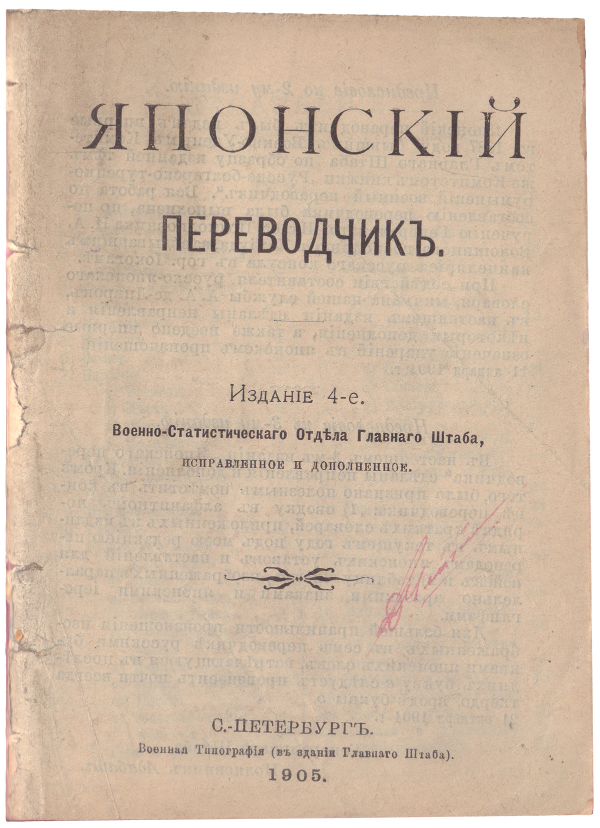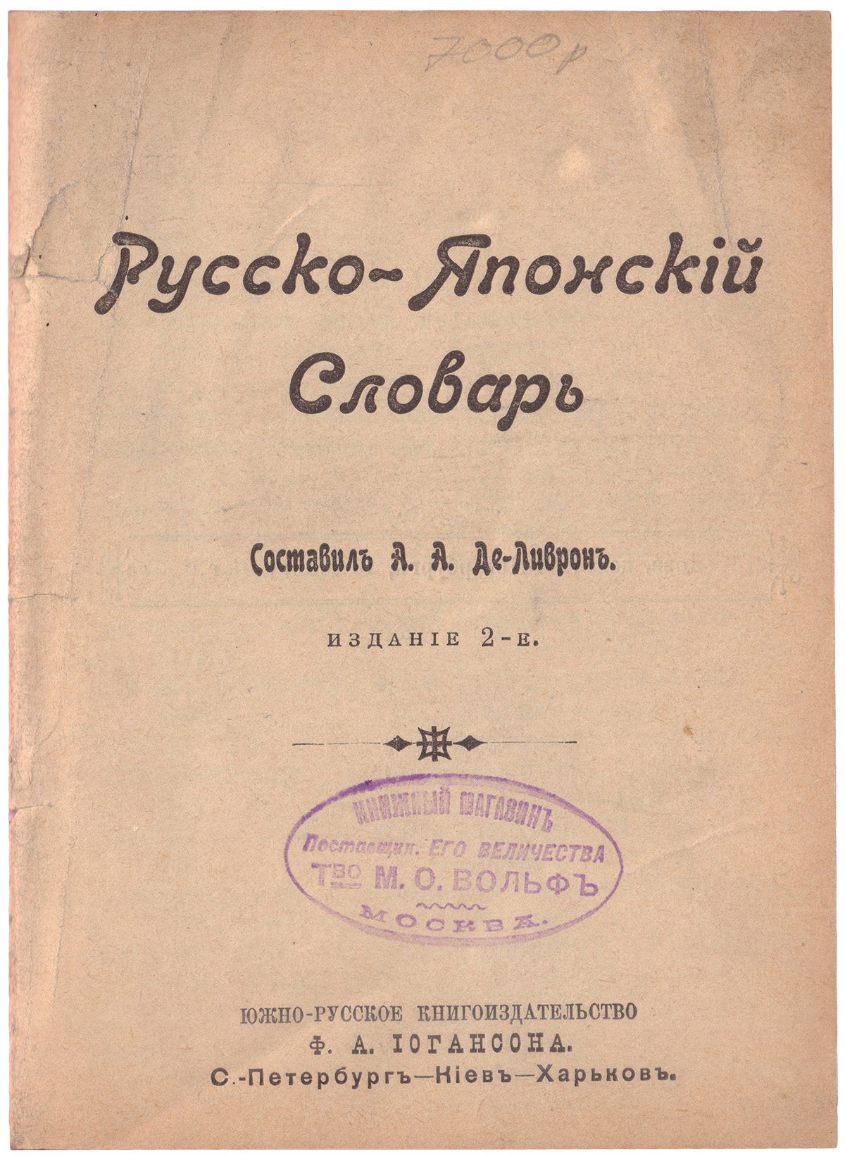 1. Русско-японский словарь / Сост. А.А. Де-Ливрон. - 2-е изд. - СПб.; Киев; Харьков: Южно-рус. книгоиздательство Ф.А. Иогансон, 1904. - 251 с.; 2. Японский переводчик / [Ханиуда; Предисл. Ген. штаба подполк. Адабаш]. - 4-е изд., испр. и доп. - СПб.: Военно-статистический отдел Главного штаба, 1905. - [4], 100 с.; 14,9х11 см.