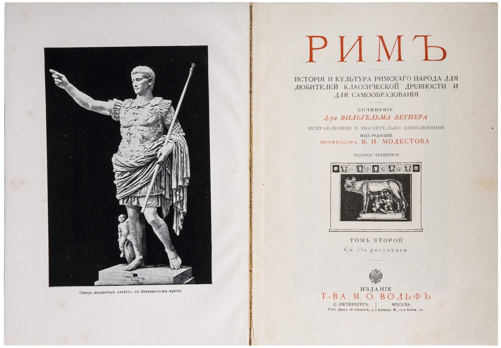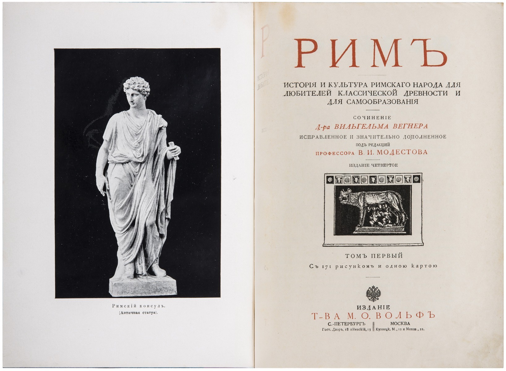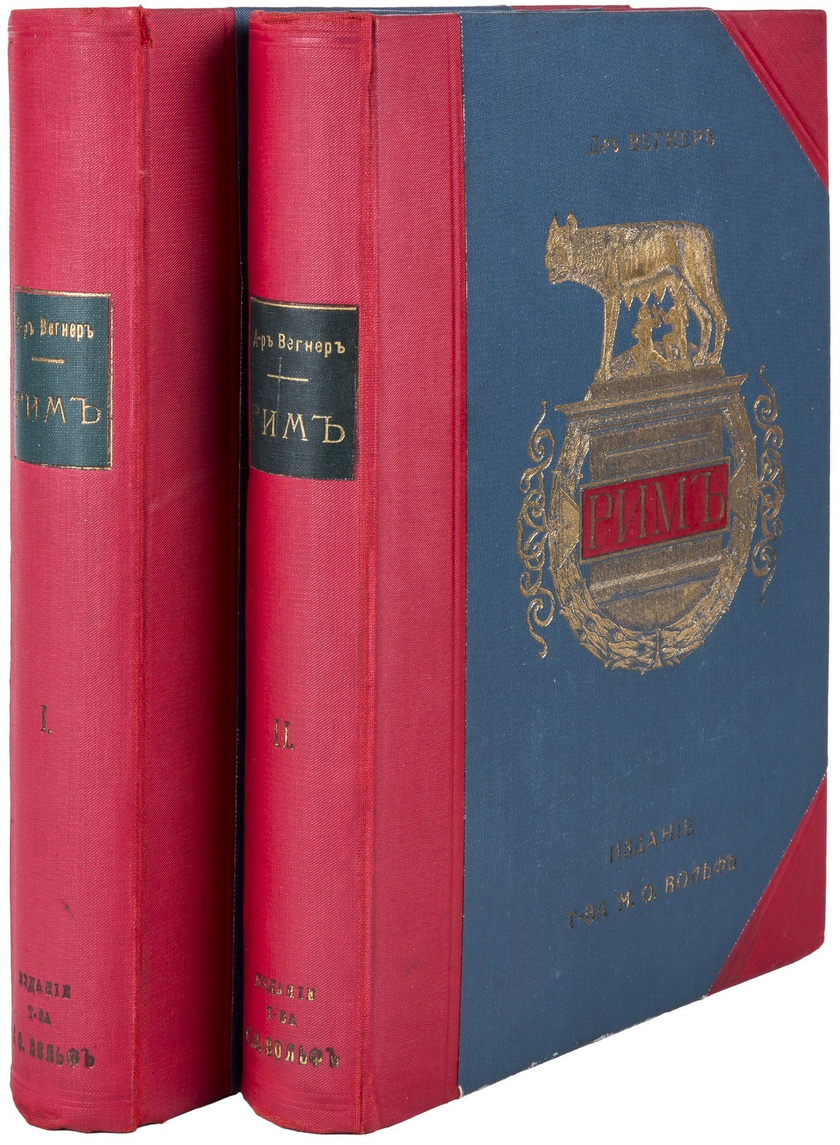 В двух издательских составных переплетах с золотым тиснением по передним крышкам и корешкам. Тройные «мраморированные» обрезы. На передних крышках изображение т.н. Капитолийской волчицы с Ромулом и Ремом, легендарными основателями Рима.