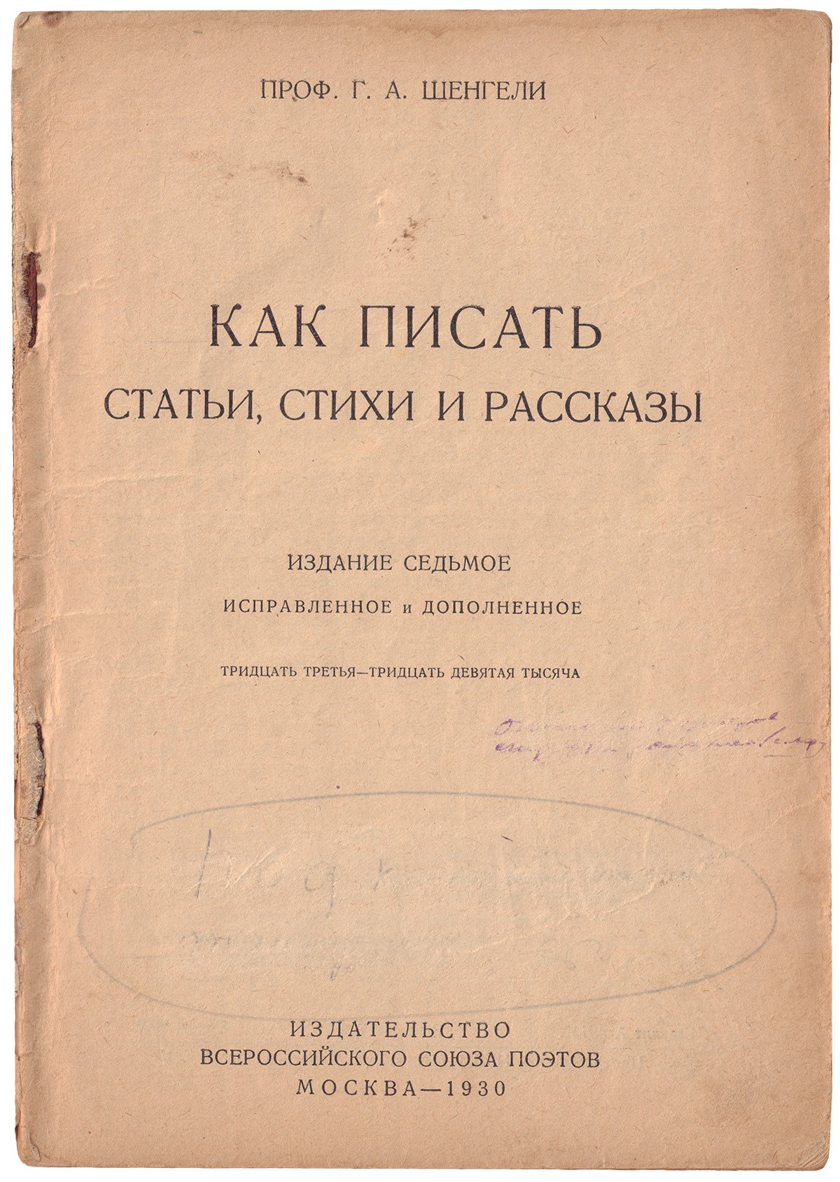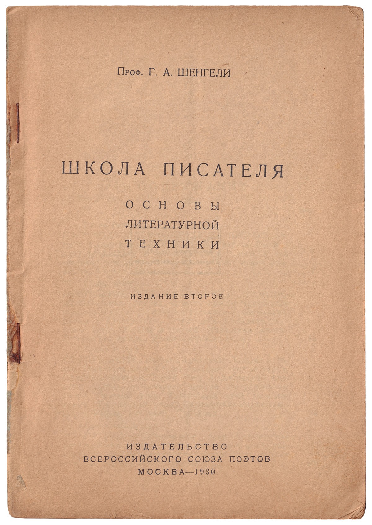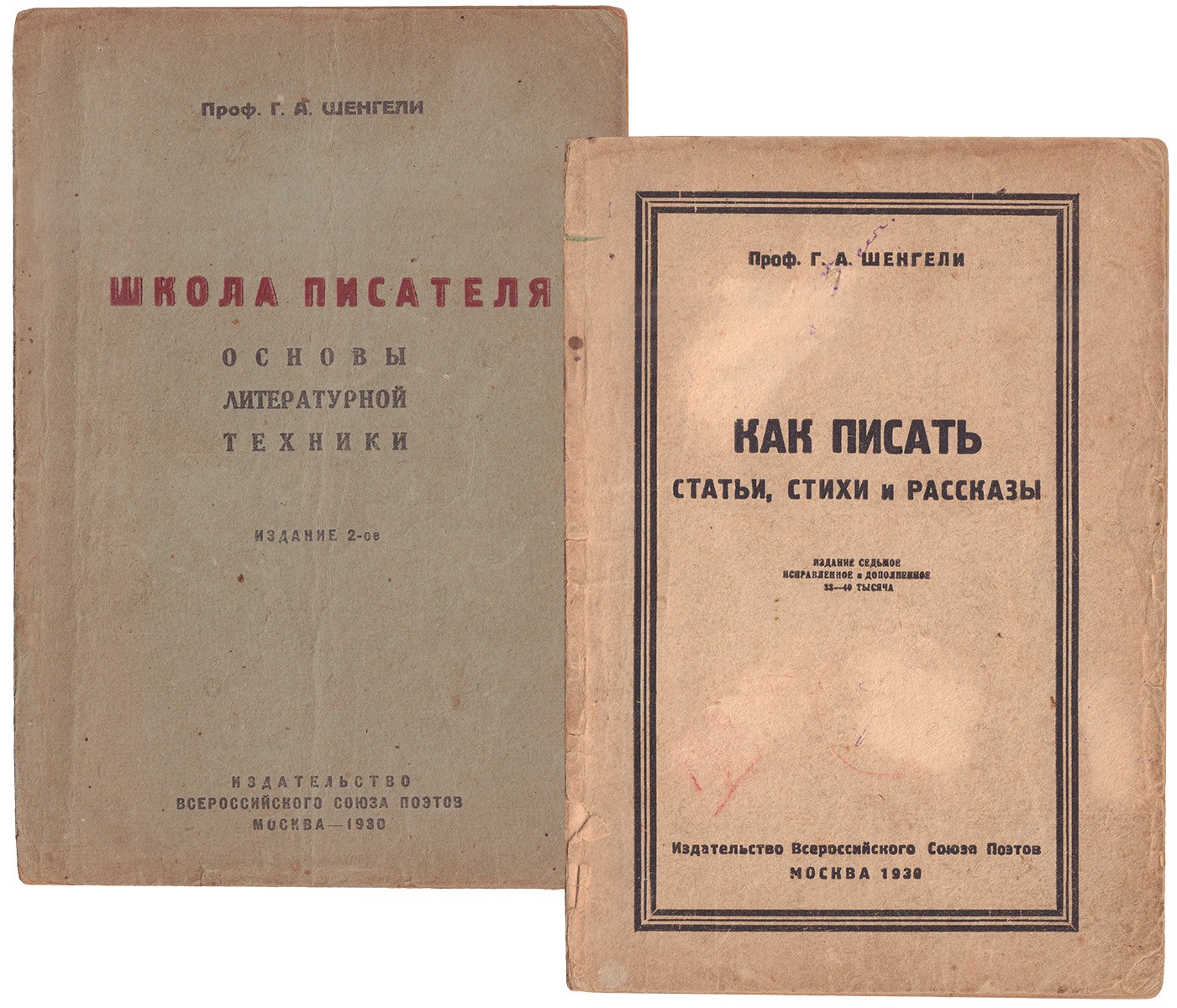 1. Шенгели, Г.А. Школа писателя : Основы литературной техники / Проф. Г. А. Шенгели. - 2-е изд. - М.: изд-во Всерос. союза поэтов, 1930. - 111 с., [1] с. объявл.; 21,5х15 см. - 5 000 экз.; 2. Шенгели, Г.А. Как писать статьи, стихи и рассказы / Проф. Г. А. Шенгели. - 7-е изд., испр. и доп. - М.: изд-во Всерос. союза поэтов, 1930. - 79 с., [1] с. объявл.; 21х14,7 см. - 8 000 экз.