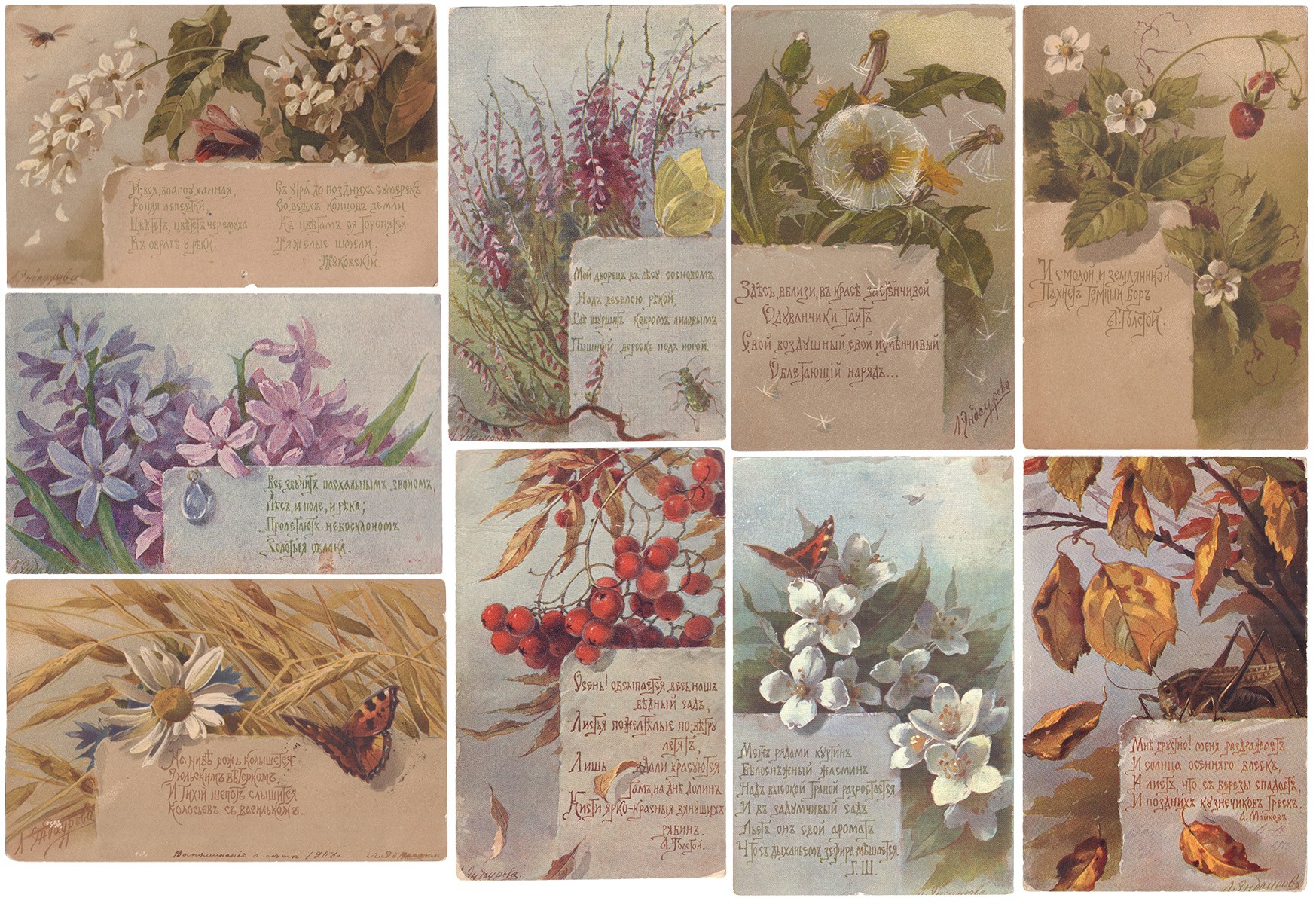 Любовь Меркурьевна Эндаурова (1853–1938?) — художник, график. Представительница русского стиля, (сестра знаменитой Елизаветы Бем). Прославилась акварелями растений. Община Св. Евгении выпустила несколько серий ее открыток, на которых строки стихов окружали полевые цветы.