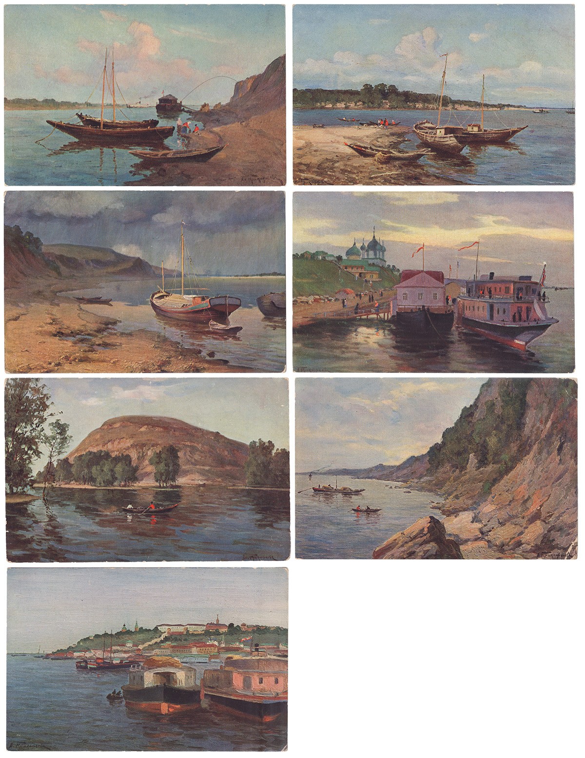 1. Волга в Жигулях. - № 594; 2. Волга; пристань «Самолет» у гор. Ярославля. - № 595; 3. Волга в полдень. - № 592; 4. Волга, Царев курган. - № 593; 5. Волга перед грозой. - № 590; 6. Волга у Столбичей. - № 591; 7. Волга у Н.-Новгорода. - № 596.