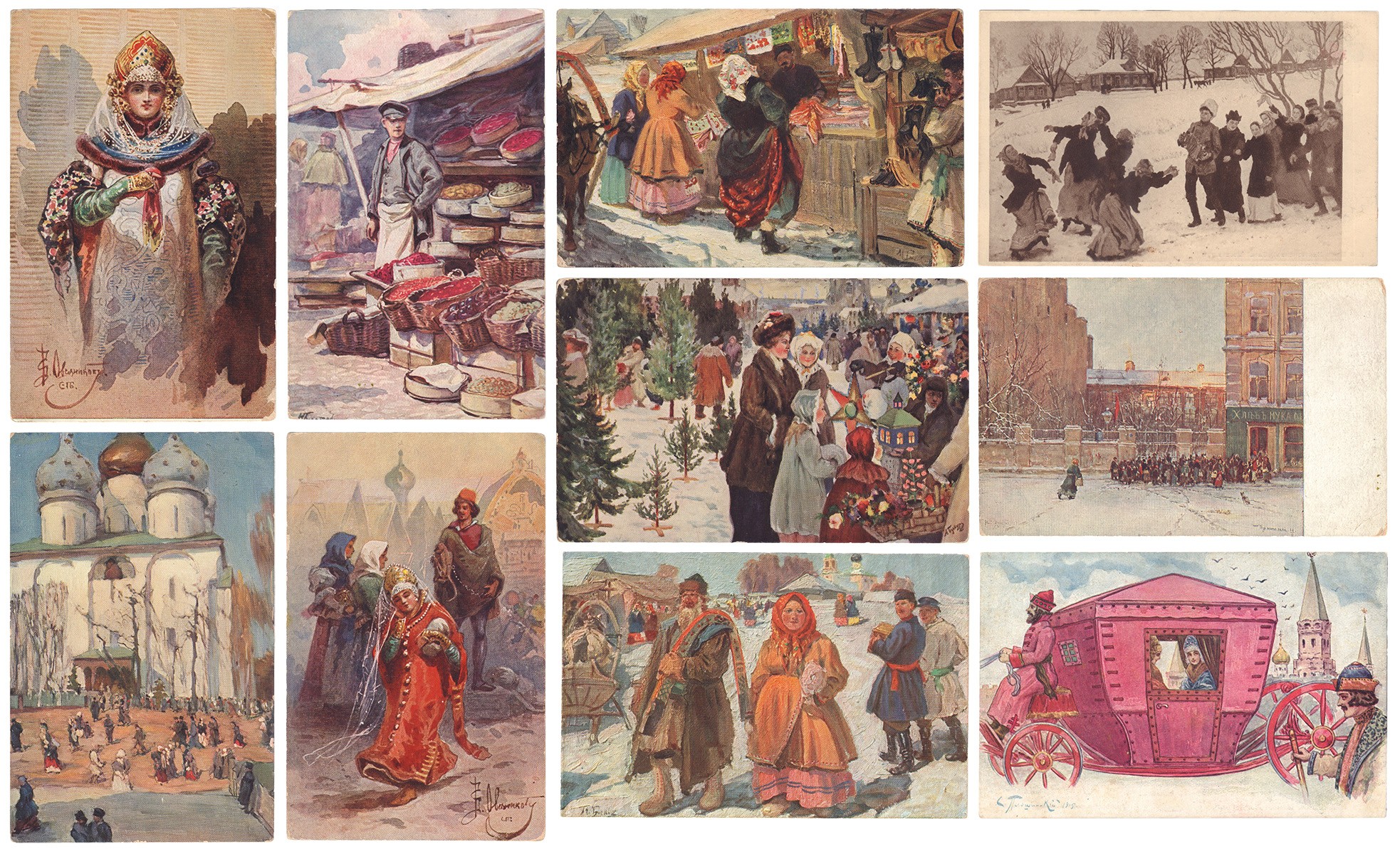 1. Боскин, М. Ярмарка. - Стокгольм: Акц. О-во Гранберг в Стокгольме, 1900-е; 2. Юон, К.Ф. Праздничный день. - СПб.: Голике и Вильборг, 1910-е; стерт. текст. 3. Плошинский, С. Старая Москва: «С праздничным визитом». - Пг.: Салон, 1916. 4. Овсяников, В.П. Боярыня. - СПб.: Голике и Вильборг, 1910-е; 5. Овсяников, В.П. Черта показывают. - СПб.: Ришар, 1910-е; 6. Богатов, Н. Типы Москвы: «Фруктовая палатка». - [Б.г.: б.и.], 1900-е; 7. Бучкури, А. Рождественский базар. - Голике и Вильборг, 1910-е; 8. Юон, К.Ф. Пляска свах. Обычай Москов. губ. - [М.]: Образование, 1900-е. 9. Боскин, М. На ярмарке. - Стокгольм: Акц. О-во Гранберг в Стокгольме, 1900-е; 10. Проф. Клевер. Хлебный хвост. - [Б.г.]: Современное искусство, 1917.