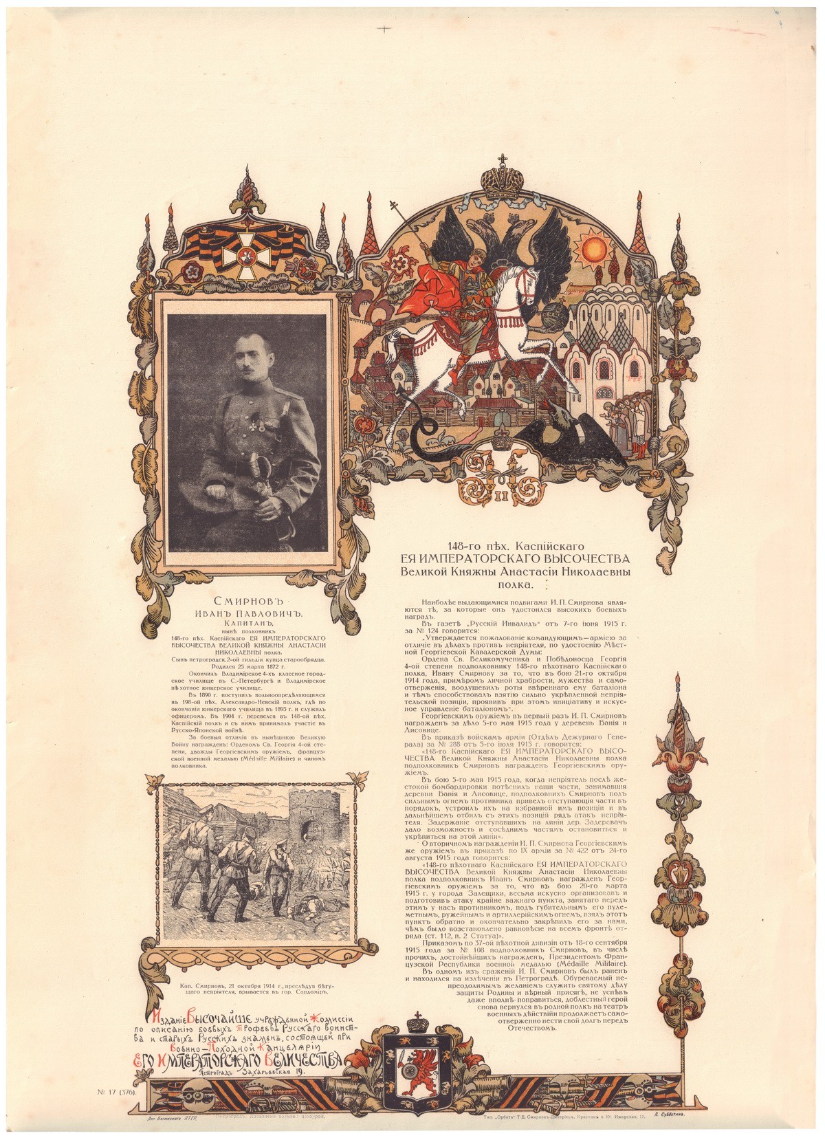 Хромолитография. В 1911 году с высочайшего разрешения императора Николая II была создана комиссия по описанию боевых трофеев Русского воинства и старых русских знамен. Одной из целей комиссии стало описание подвигов и съемка портретов (фотографий) отличившихся георгиевских кавалеров первой мировой войны.