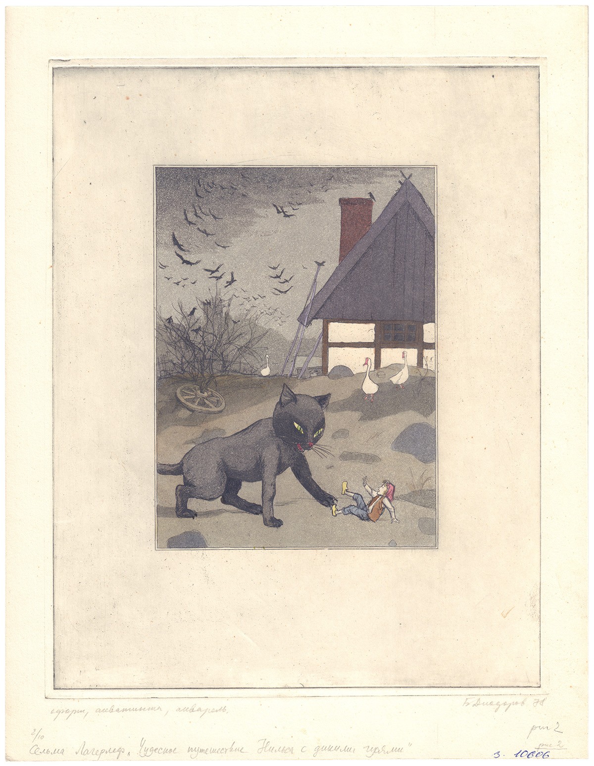 Офорт, акватинта, авторская раскраска. Авторская подпись в правом нижнем углу. Иллюстрация к книге Сельмы Лагерлёф «Чудесное путешествие Нильса с дикими гусями». Отпечаток 2/6.