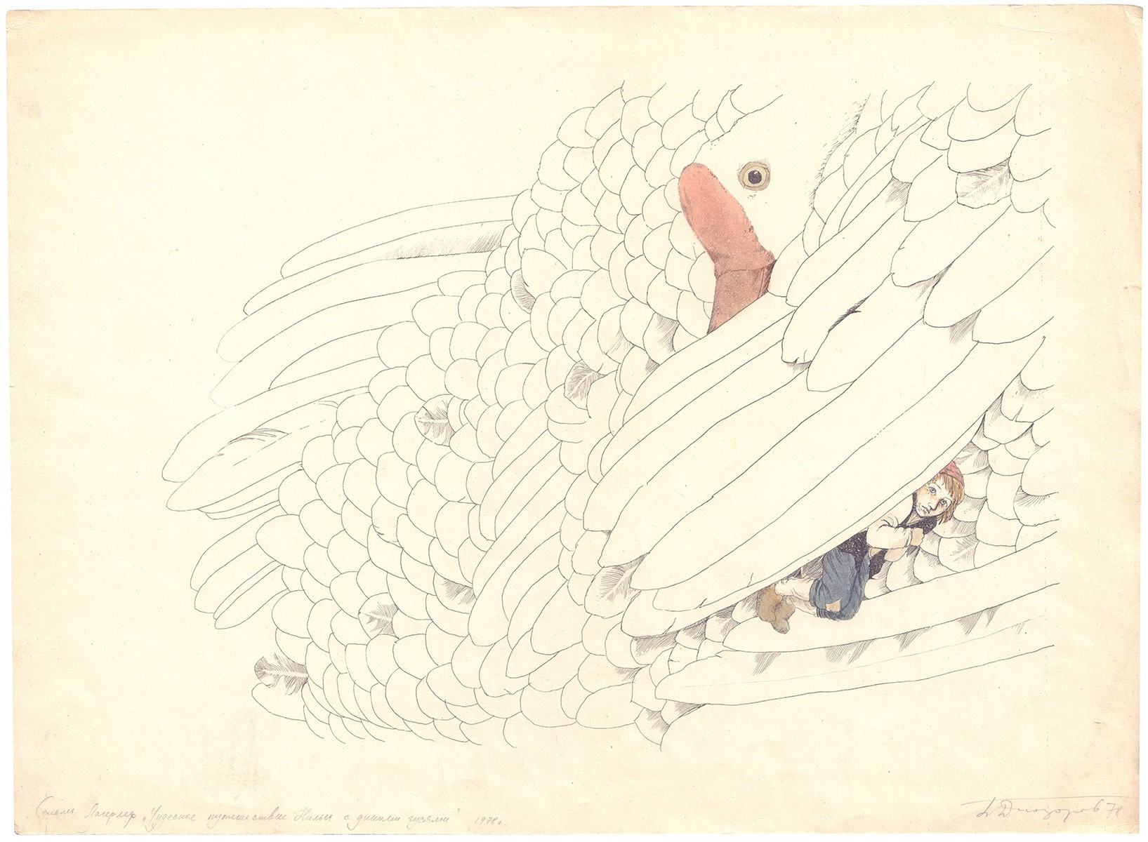 Авторская подпись в правом нижнем углу. Иллюстрация к книге Сельмы Лагерлёф «Чудесное путешествие Нильса с дикими гусями».