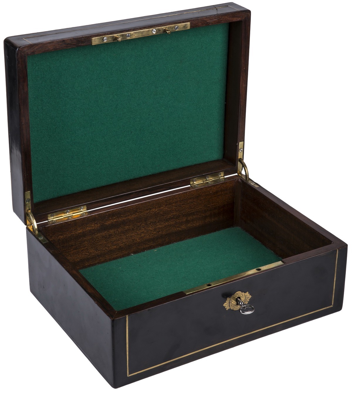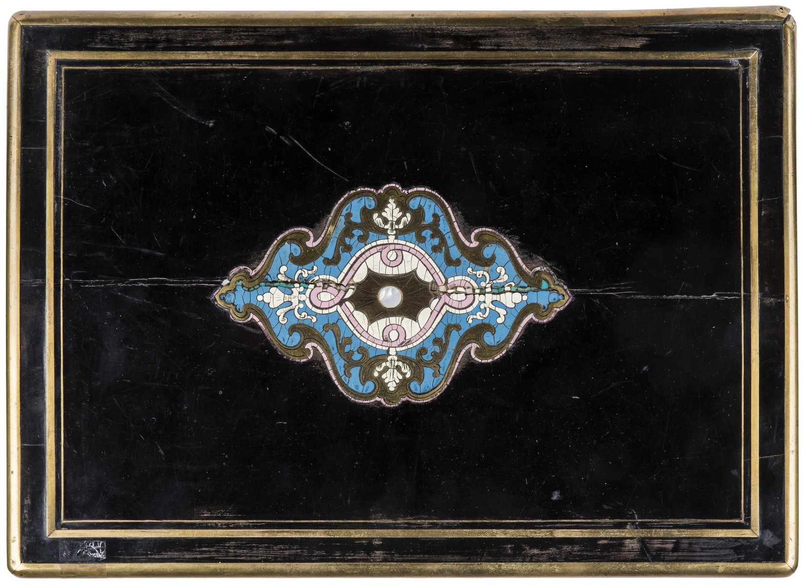 Трещина вдоль крышки. Одна из латунных накладок отходит от корпуса. Следы бытования.