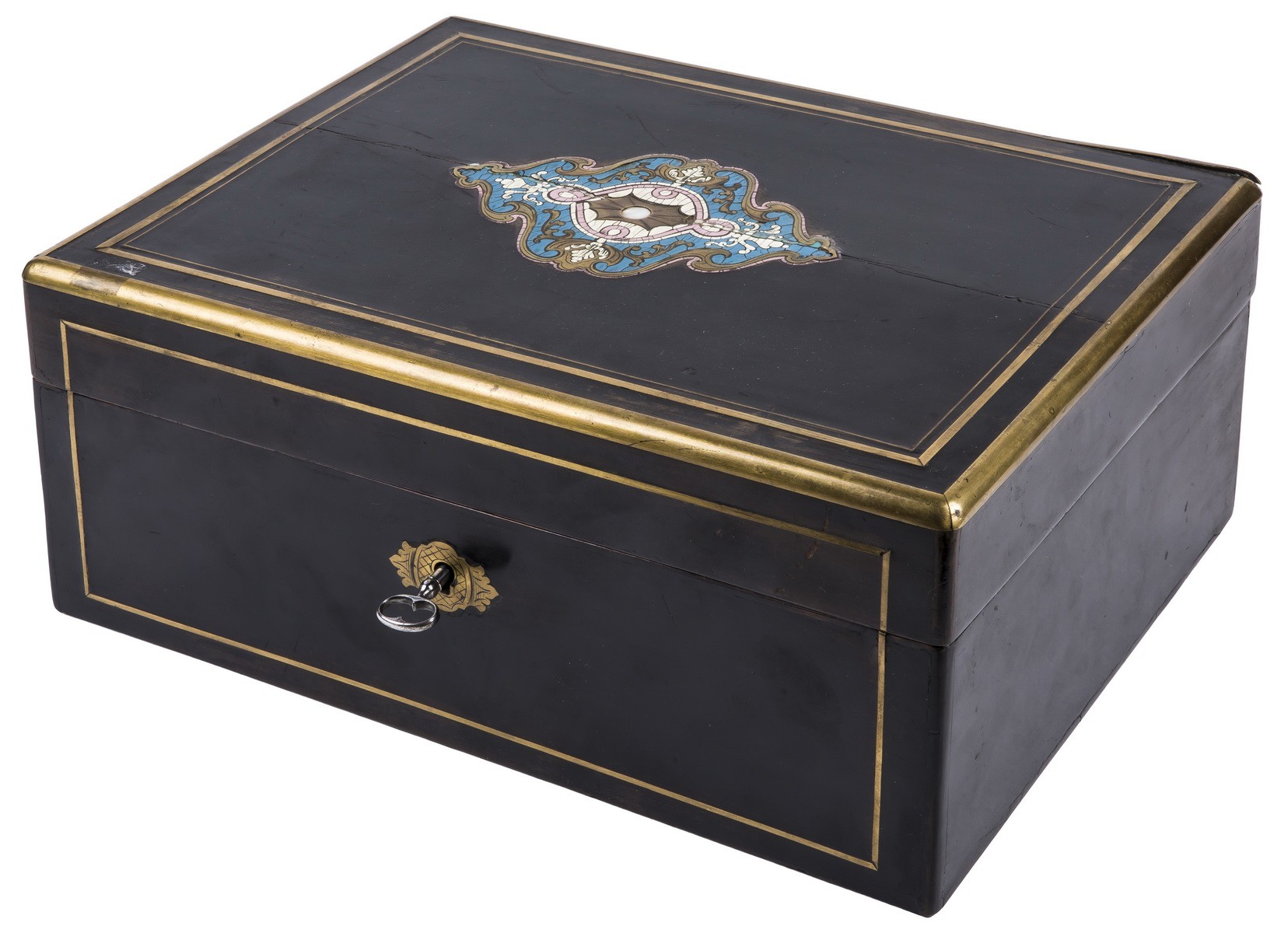 Дерево, лак, латунь, перламутр; бархат. Ключ в наличии.