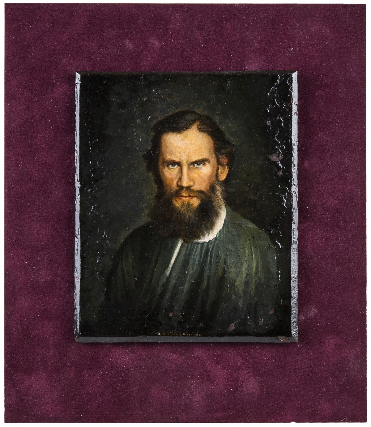Папье-маше, лак, роспись. В нижней части портрета авторская подпись и дата. Портрет наклеен на подложку.