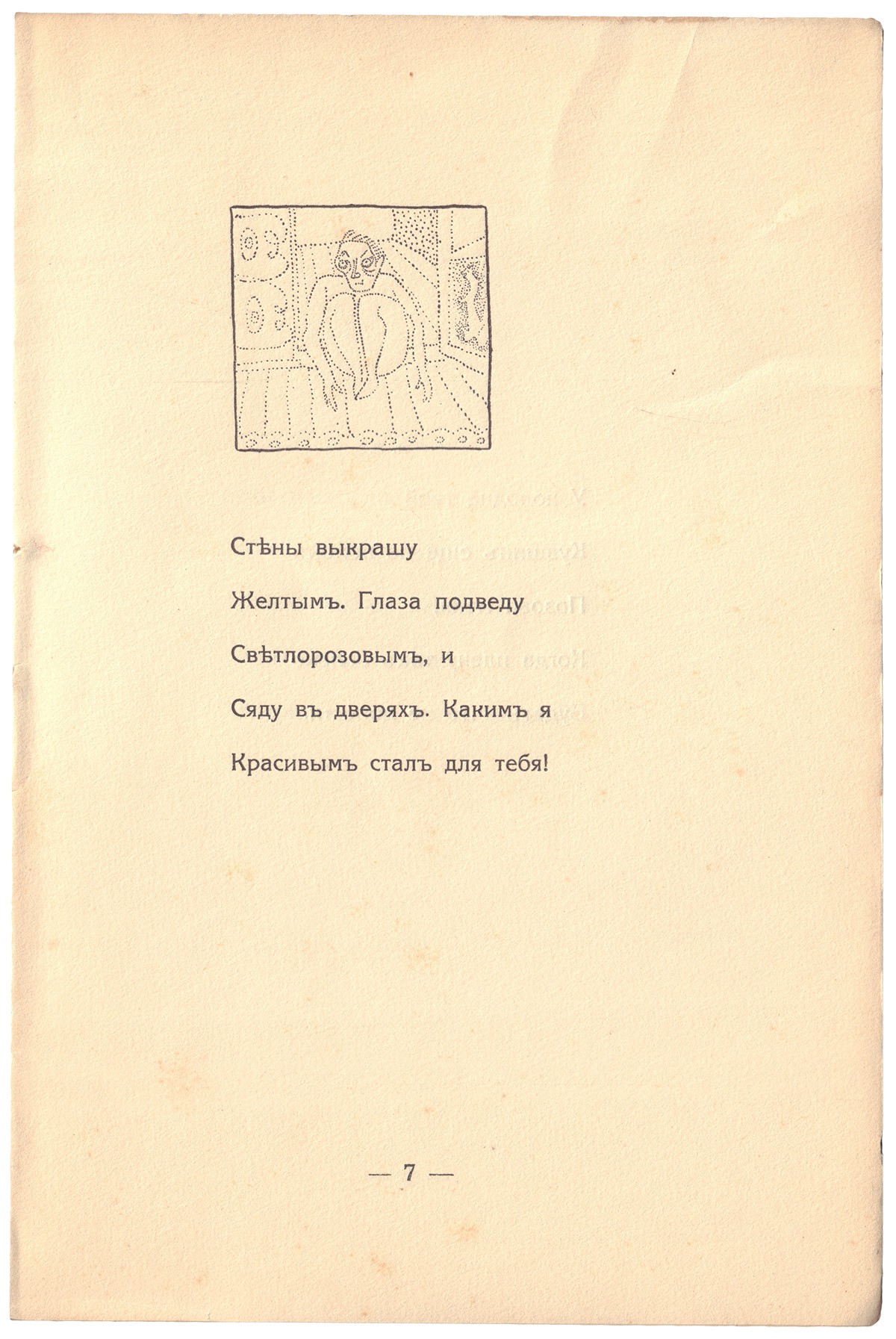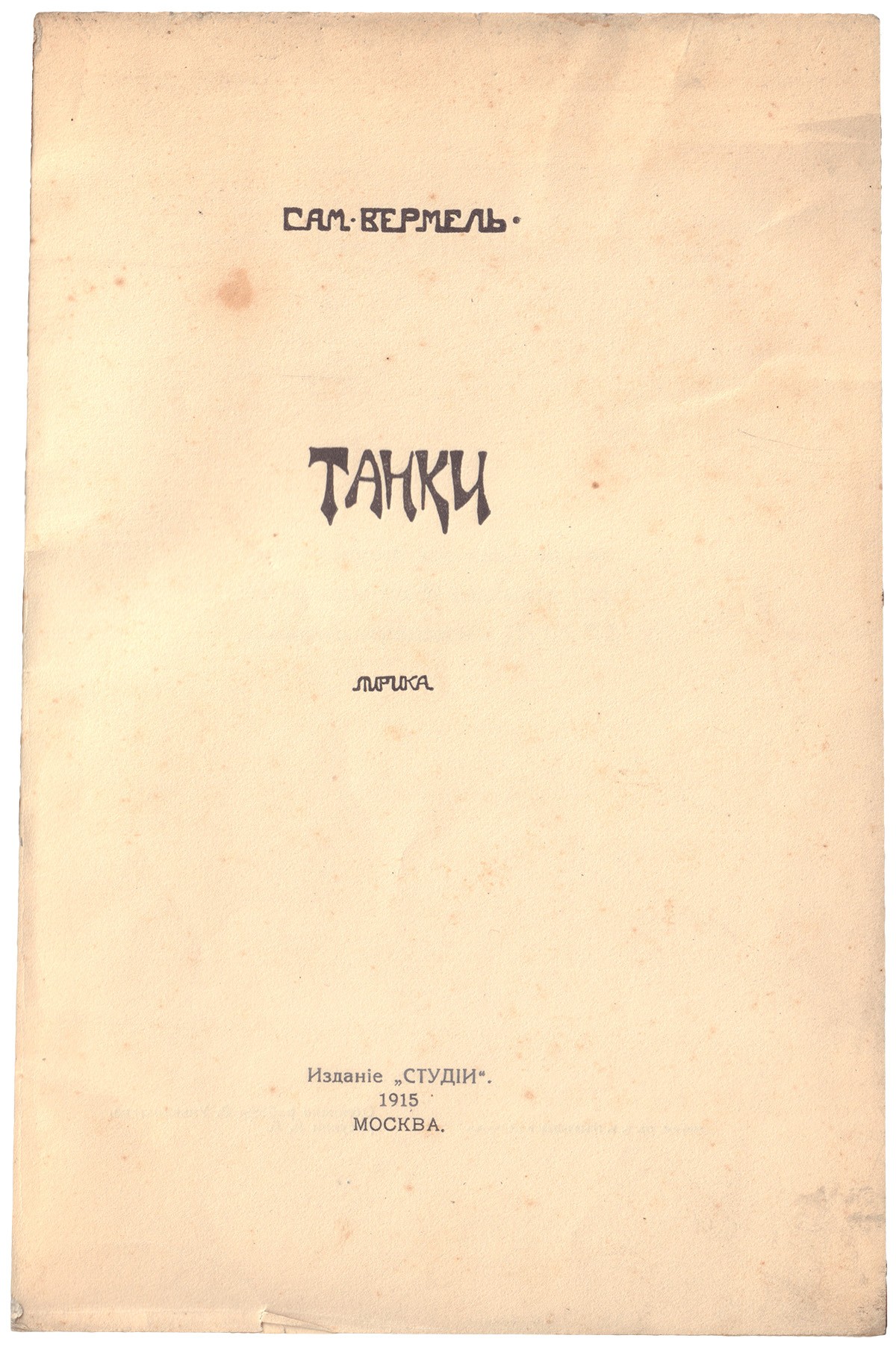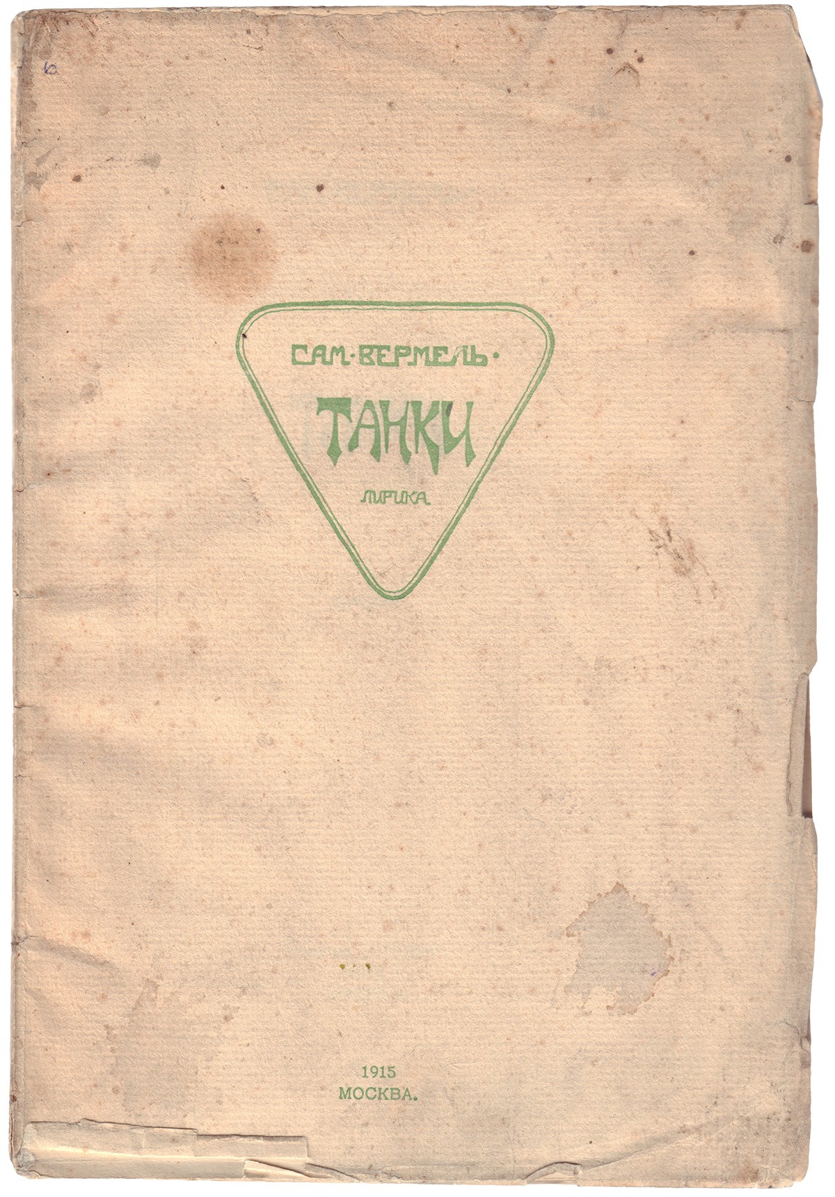 Футуристическое издание с рисунками Давида Бурлюка, выпущенное тиражом 500 экземпляров. Самуил Матвеевич Вермель (ок. 1892–1972) — поэт-любитель, режиссер, ученик Вс. Мейерхольда, брат поэта Филиппа Вермеля. Кроме данного сборника издал в 1916 г. вместе с Д. Бурлюком альманах «Московские мастера». Давид Давидович Бурлюк (1882-1967) — поэт, художник, один из основоположников русского футуризма, теоретик и пропагандист нового искусства, один из лидеров русского художественного авангарда конца 1900-1910-х годов.