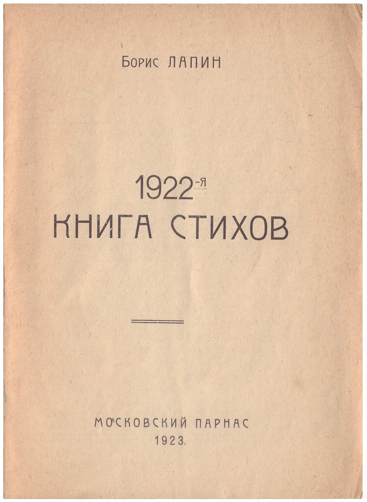 Борис Матвеевич Лапин (1905-1941) — поэт, журналист, военный корреспондент. Начал литературную деятельность в 1920 г. со стихов, примыкал к экспрессионистам, близок к направлению «Центрифуга». Затем организовал свой «Московский парнас» (1922). Позже из поэзии он ушёл в журналистику. Публиковал отчеты о поездках на Памир, Дальний Восток и прозаические произведения. «1922-я книга стихов» единственный сборник, еще два опубликовал в совместно с Е. Габриловичем и З. Хацревиным. Розанов № 3180, Турчинский, с. 291.