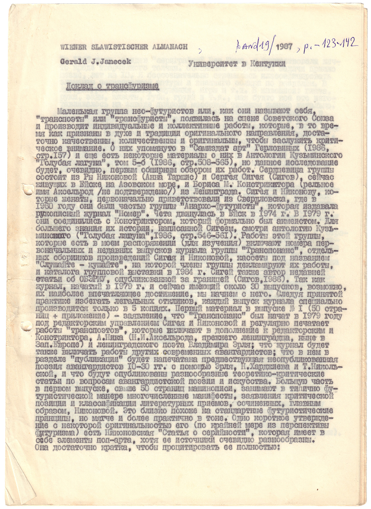 Листы подшиты в папку. Авторская рукопись доклада американского профессора-слависта Джеральда Дж. Яначека для университета Кентукки.
