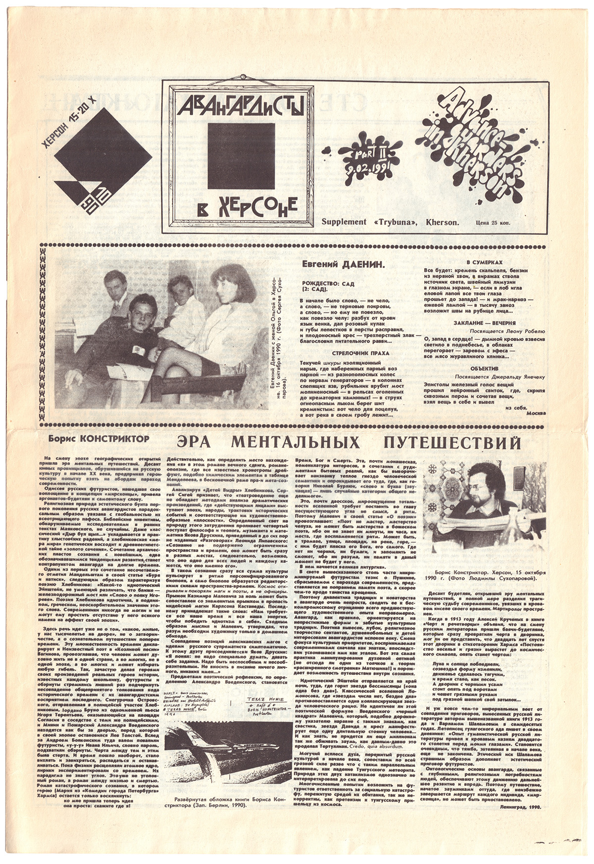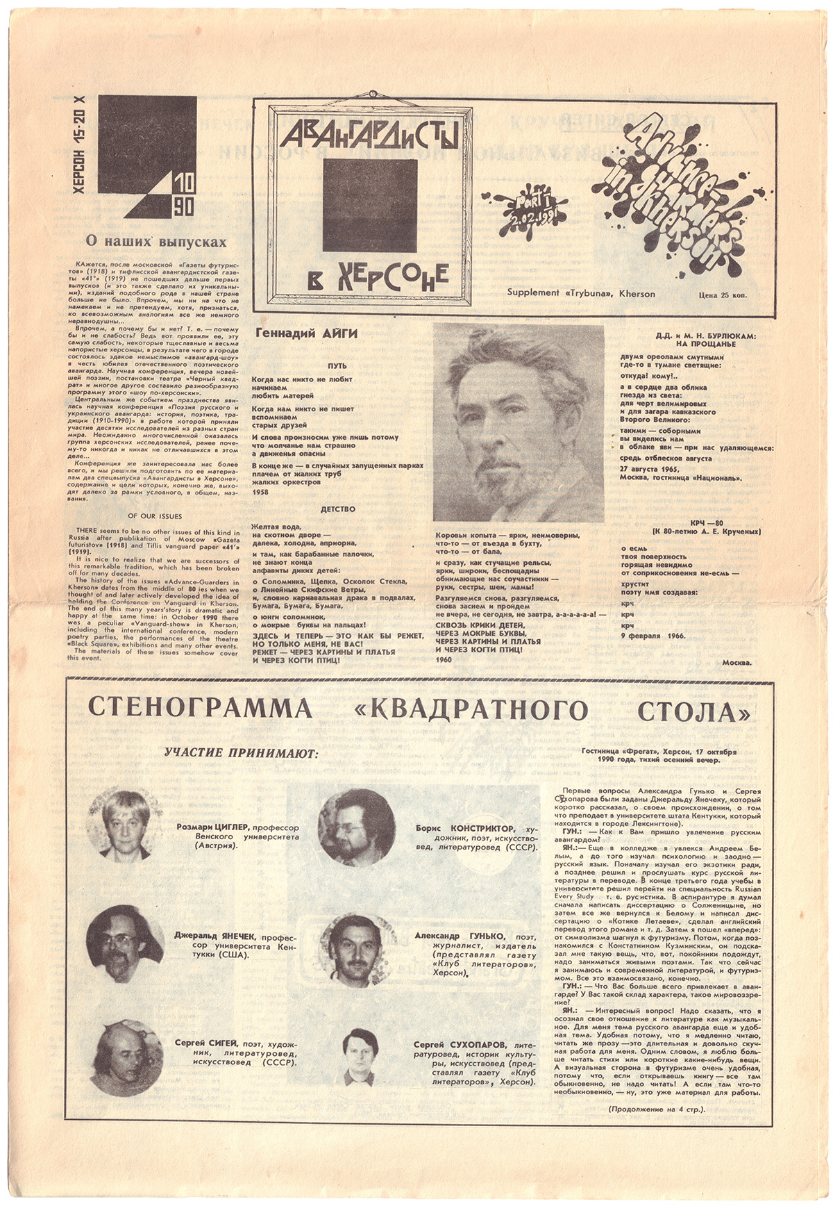Херсон тесно связан с историей литературного и художественного авангарда (в первую очередь, с именами Крученых, Бурлюков, Хлебникова, Гнедова, Харджиева). Сергей Сухопаров, автор первой на русском языке монографии, посвященной творчеству Алексея Крученых, в октябре 1990 года пригласил в Херсон авангардистов и ученых-славистов - Сергея Сигея, Бориса Констриктора, Евгения Даенина, Егора Радова, Розмари Циглер (Австрия) и Джеральда Янечека (США). Результатом стали два выпуска газеты «Авангардисты в Херсоне» (приложения к газете "Народна трибуна"). Выпуски позиционировались как издание, продолжающее традиции русского авангарда.