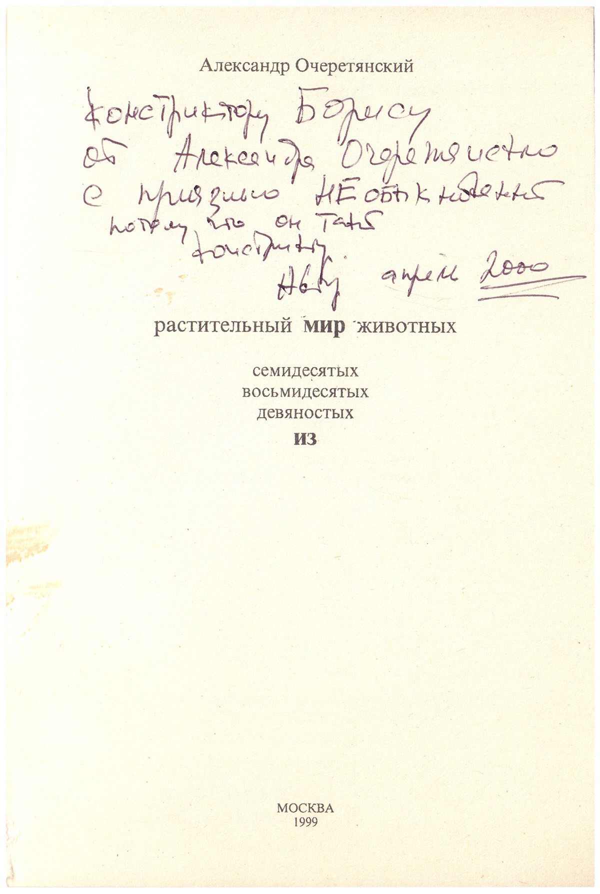 На тит.л. дарственная надпись автора: "Борису Констриктору от Александра Очеретянского с приязнью необыкновенной потому, что он такой констриктор. Автор. Апрель 2000".