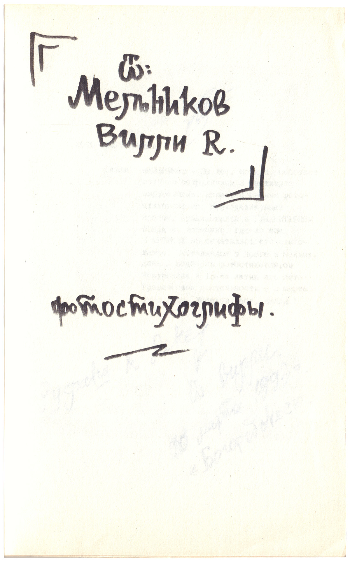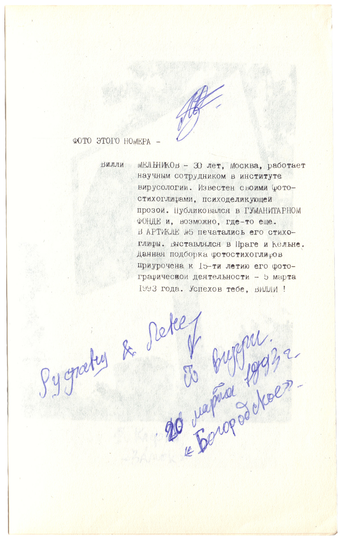 На стр. с биографией автора дарственная надпись, обращенная к семье Элининых: "Руслану & Лене / от Вилли / 20 марта 1993 г. / "Богородское".
