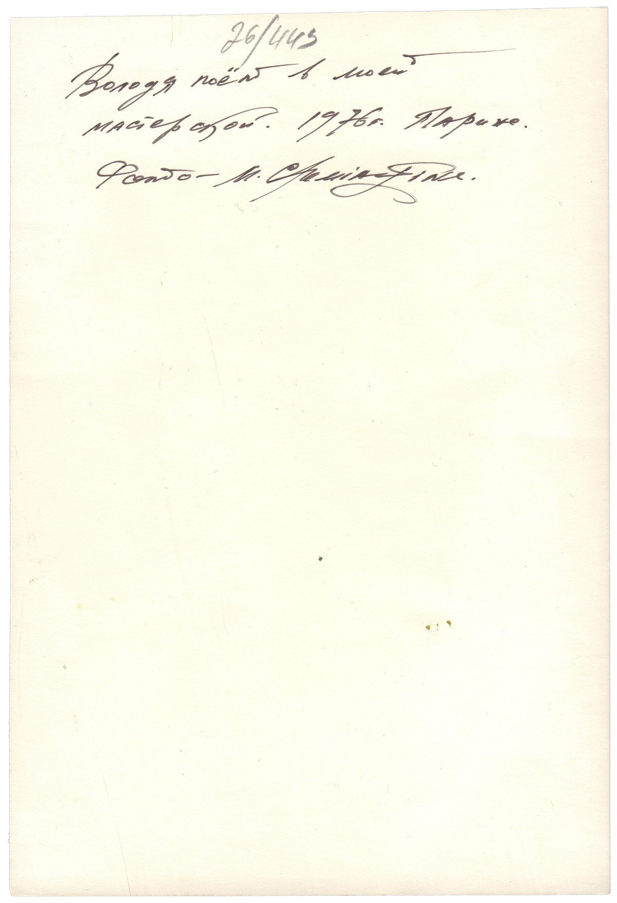 На обороте надпись Михаила Шемякина "Володя поет в моей мастерской. 1976. Париж. Фото - M.Chemiakine".