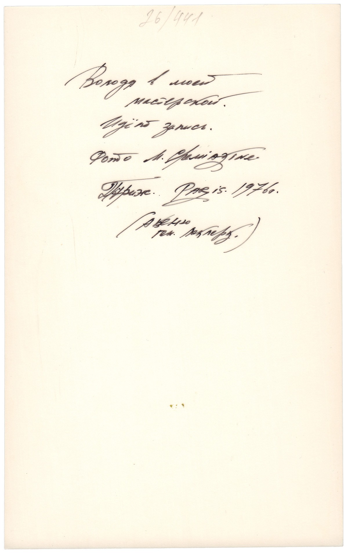 На обороте надпись Михаила Шемякина "Володя в моей мастерской. Идет запись. Фото - M.Chemiakine. Париж. 1976.".