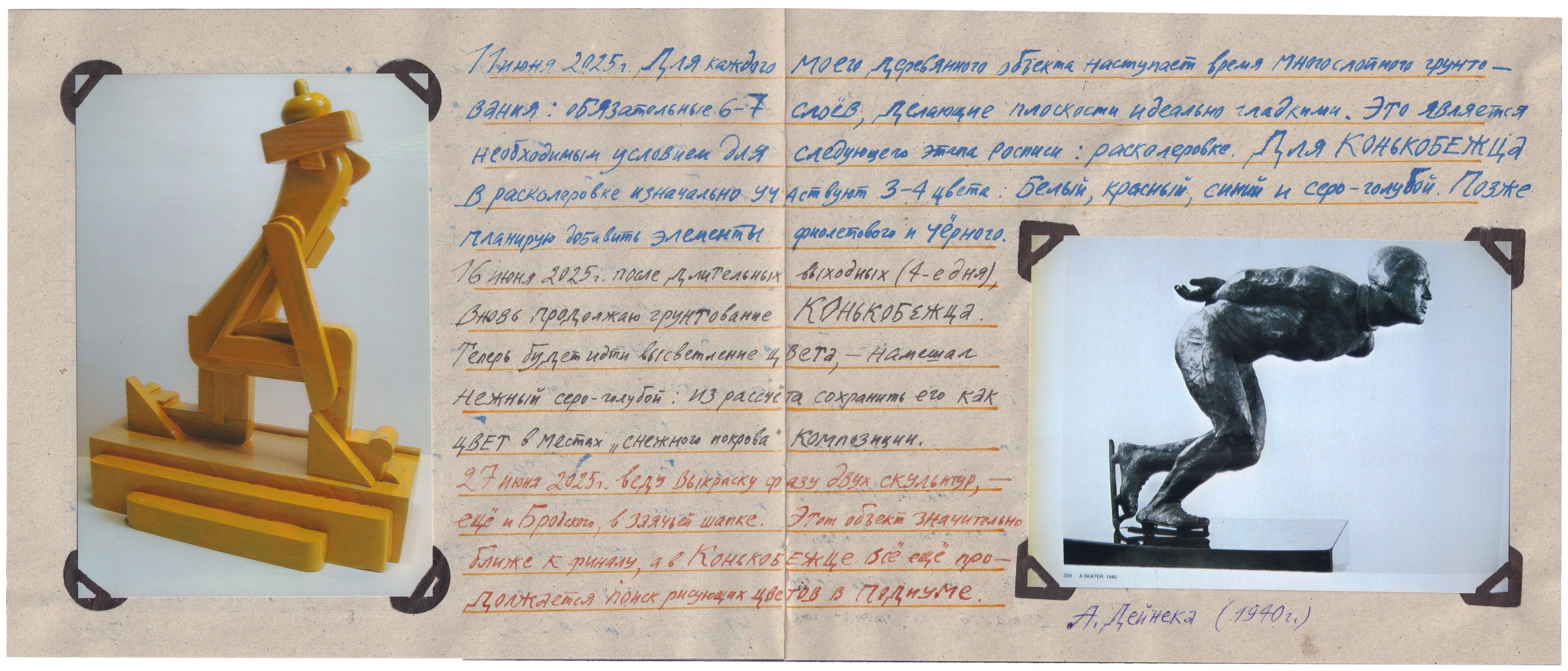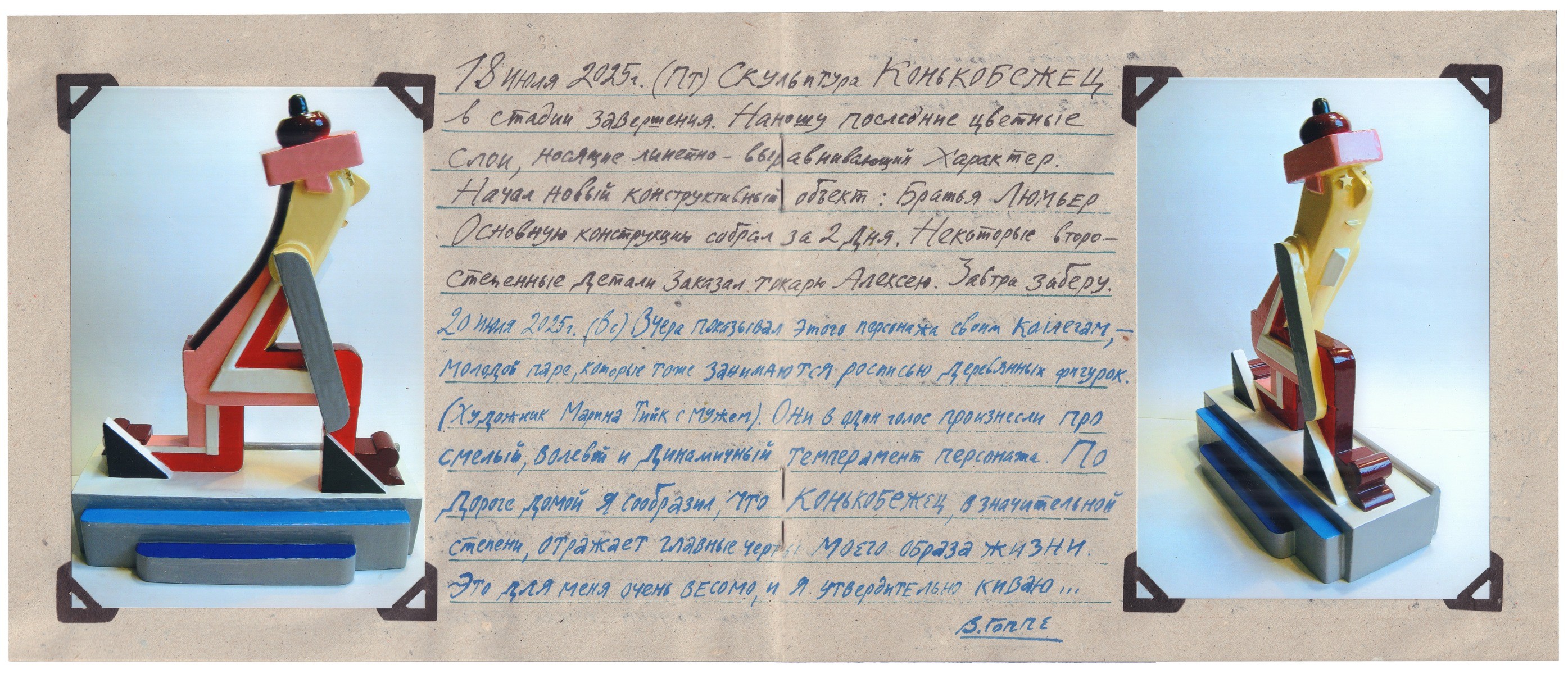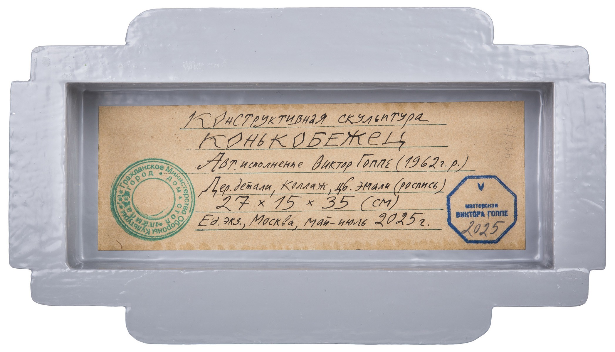 Дерево; роспись цветными эмалями. Выполнена в единственном экземпляре. Бум. авторская этикетка с рукописными выходными данными и штампом мастера на основании. Прилагается папка с описанием хода работы.