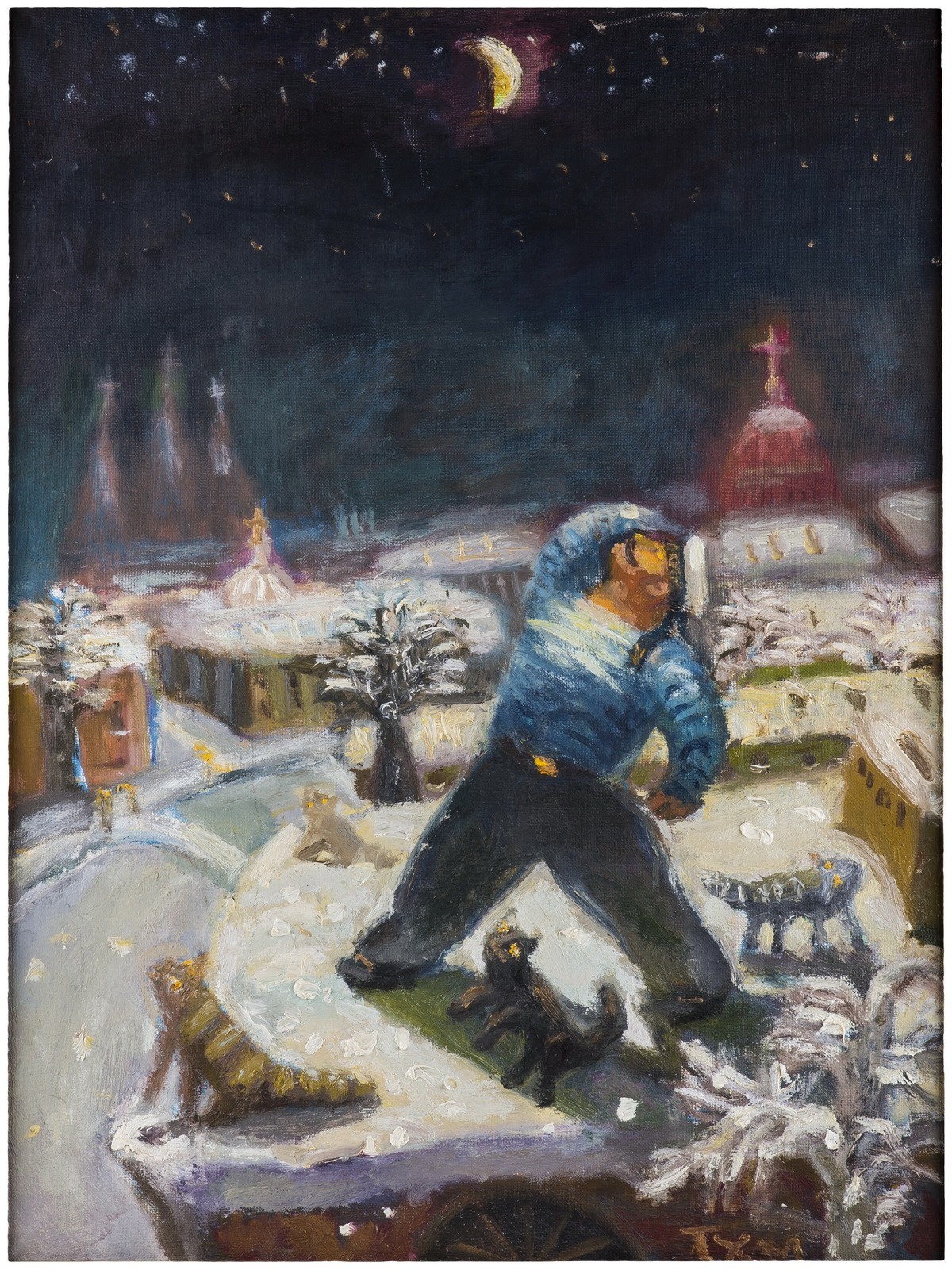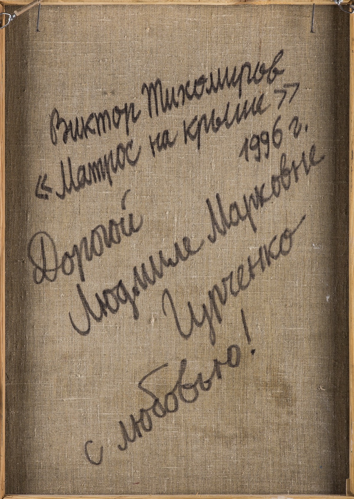 Внизу справа: «ТХМ». На обороте: «Виктор Тихомиров// "Матрос на крыше"// 1996// Дорогой Людмиле Марковне Гурченко с любовью!» Оформлена в раму.