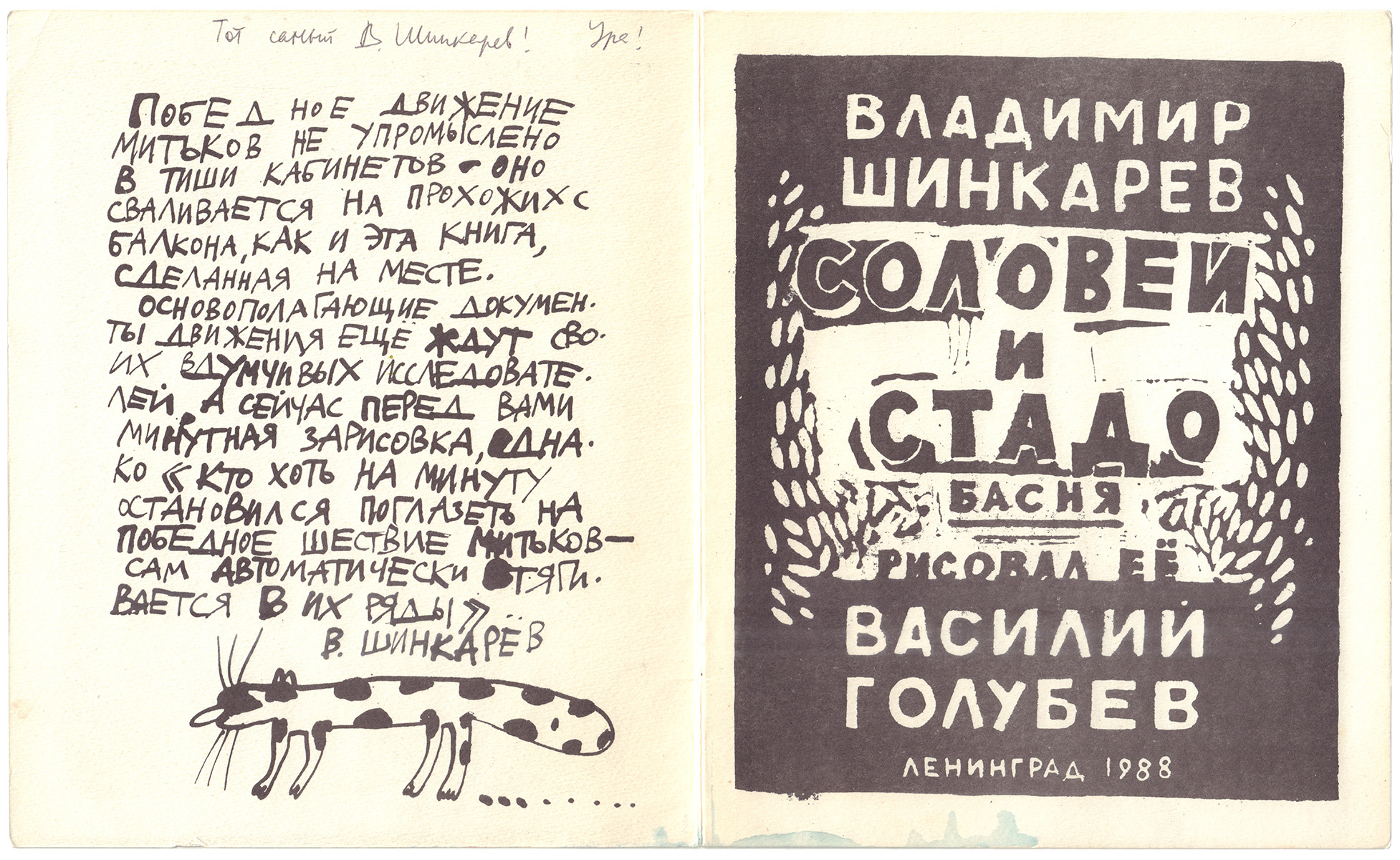 Владимир Николаевич Шинкарев (1954) – поэт, писатель, художник. Идеолог митьковского движения: написанная в 1984 году и распространявшаяся в самиздате книга Шинкарева «Митьки» - уникальный пример мифотворчества - была воспринята читателями как описание существующей реальности. Один из основателей группы и издательства «Митькилибрис». Лауреат премии Иосифа Бродского (2008).