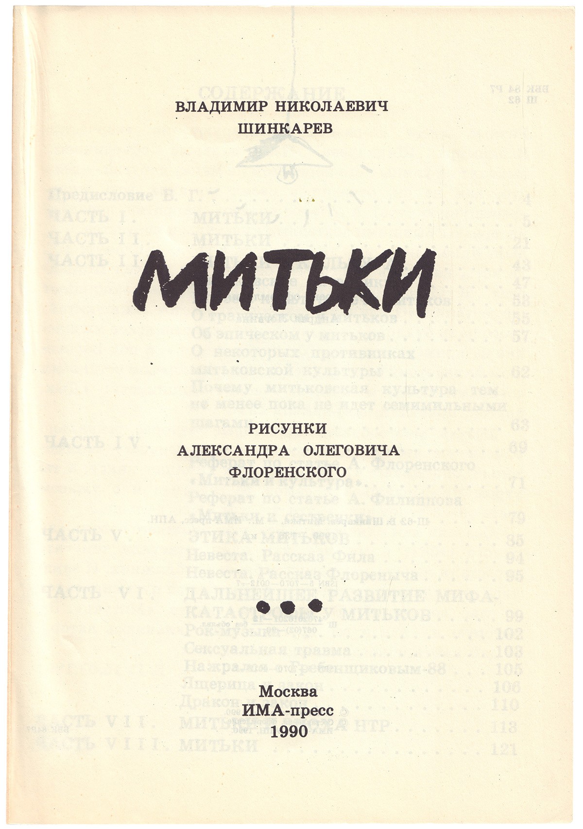 Произведение Владимира Шинкарёва, ставшее литературным манифестом группы «Митьки» (В. Шинкарёв, Д. Шагин, А. Флоренский, О. Флоренская, В. Тихомиров и др.), впервые выступивших весной 1985 года на 6-й выставке ТЭИИ (Товарищества экспериментального изобразительного искусства). Текст декларировал появление нового «массового молодежного движения», со своим причудливым, пародийным стилем поведения, особым лексиконом, а также использованием юмористического петербургского фольклора, многочисленных цитат из популярных советских фильмов и молодежного сленга. В 1985 г. книга вышла в «самиздате»; только в конце эпохи «перестройки» манифест «Митьков» получилось отпечатать в типографии.