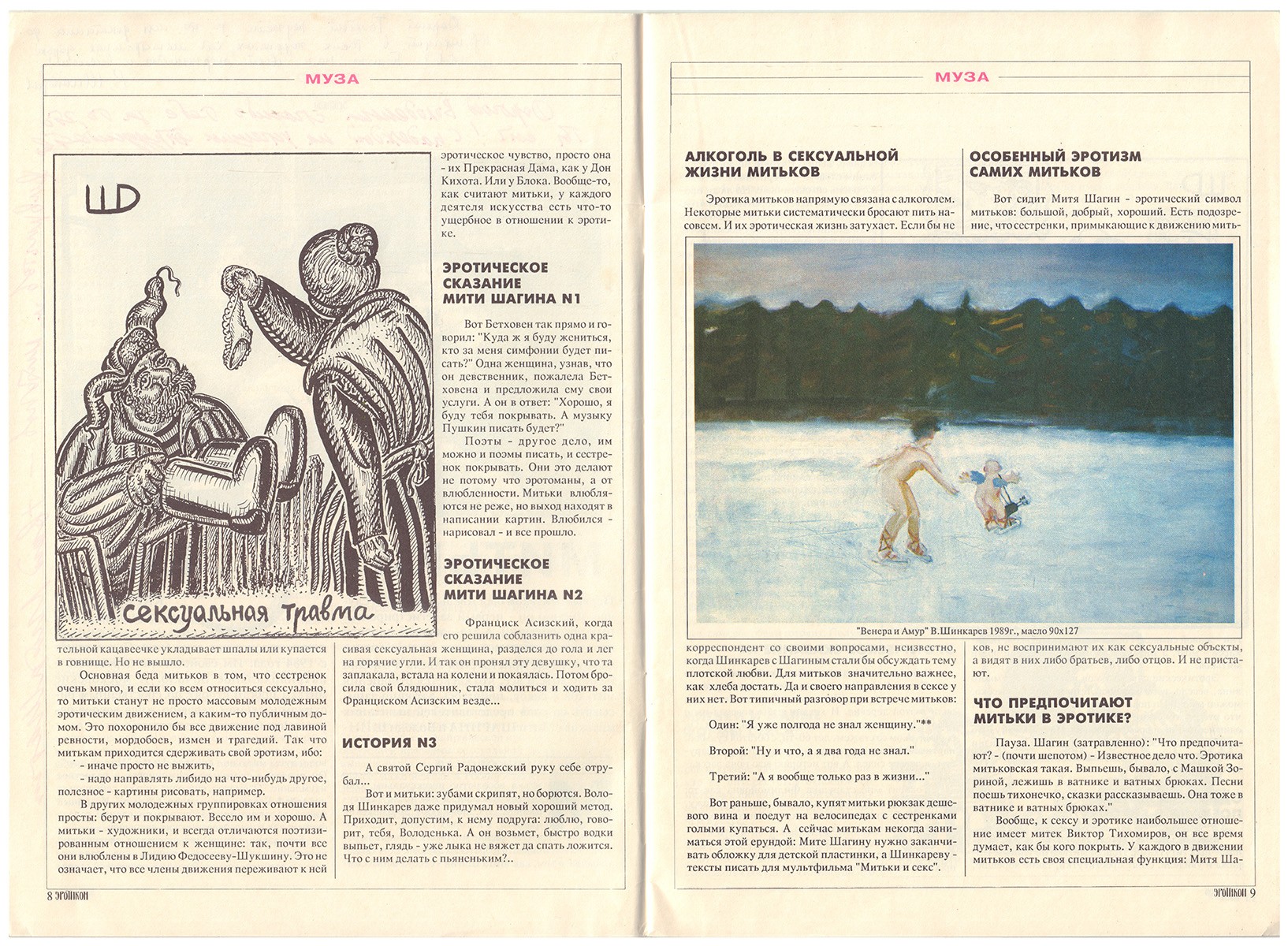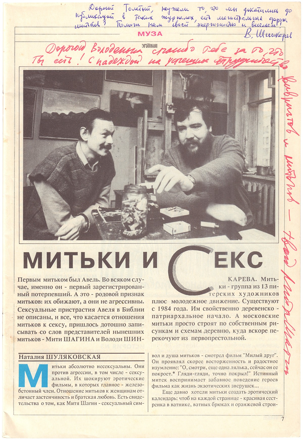 На стр.7, открывающей публикацию материала, дарственные надписи Владимира Шинкарева и Дмитрия Шагина, адресованные В.С. Котлярову: "Дорогой Толстый, неужели то, что иы докатились до публикаций с таких журналах, есть магистральная дорога митьков? Помоги нам своей энергичностью и весельем! В. Шинкарев". "Дорогой Володенька! Спасибо тебе за то, что ты есть! С надеждой на улучшение трудоустройства вивристов и митьков - твой Митя Шагин".