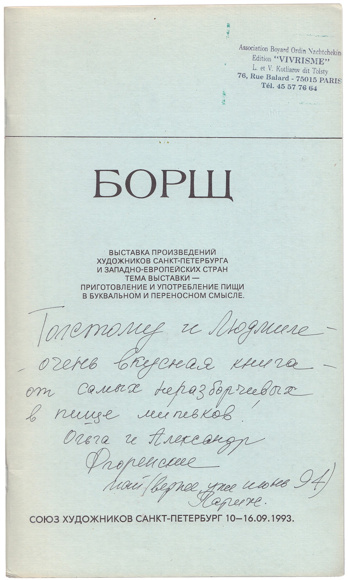 На тит. л. дарственная надпись художников Флоренских, адресованная семье В.С. Котлярова: "Толстому и Людмиле - очень вкусная книга - от самых неразборчивых в пище митьков! / Ольга и Александр Флоренские / май/ вернее уже июнь 94) Париж". Штамп издательства "Vivrisme".