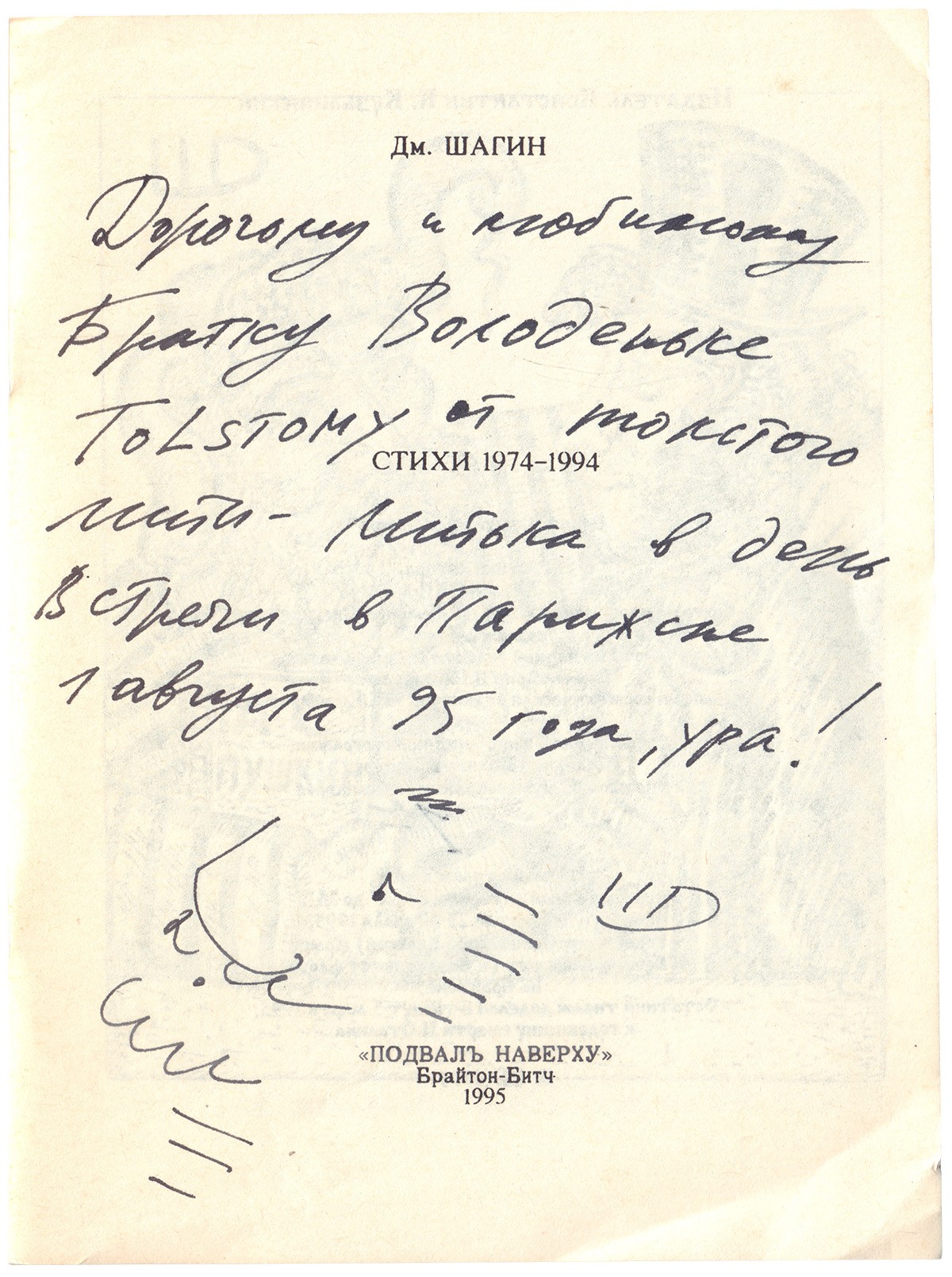 На тит. л. дарственная надпись с рисунком автора: " Дорогому и любимому / Братку Володеньке / Tolstomy от толстого / Мити -Митька в день / встречи в Париже / 1 августа 95 года, ура!"