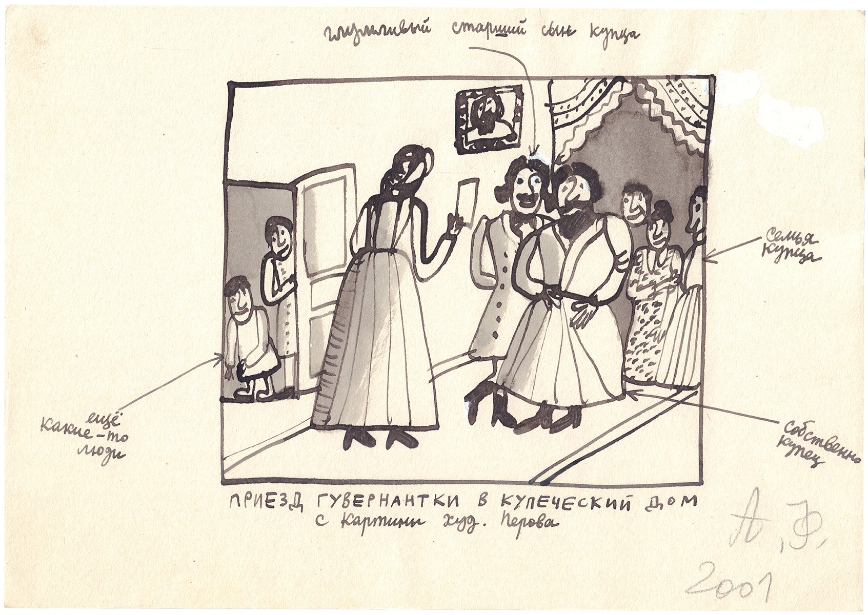 Флоренский, А.О. Приезд гувернантки в купеческий дом. С картины худ. Перова. 2001. Бумага тушь, акварель, карандаш. - 24x17 см. - Из рисунков к "Русской серии".