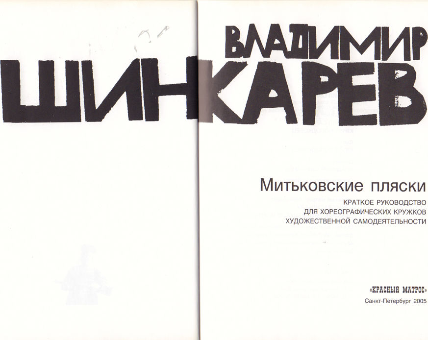 1. Шинкарев, В.Н. Митьковские пляски. Краткое руководство для хореографических кружков художественной самодеятельности / Владимир Шинкарев. -. СПб.: Красный матрос, 2005. - 77, [12] с., ил.; 16,4 × 12,8 см. 2. Баделина, С [автограф] Митьковские пляски. Перпевки Светланы Баделиной. Комплект открыток. - СП., 1914. - 9 л.; 15х10 см.