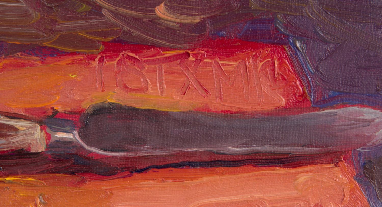 В правой части холста — инициалы автора. На обороте — подпись автора, название работы и дата
