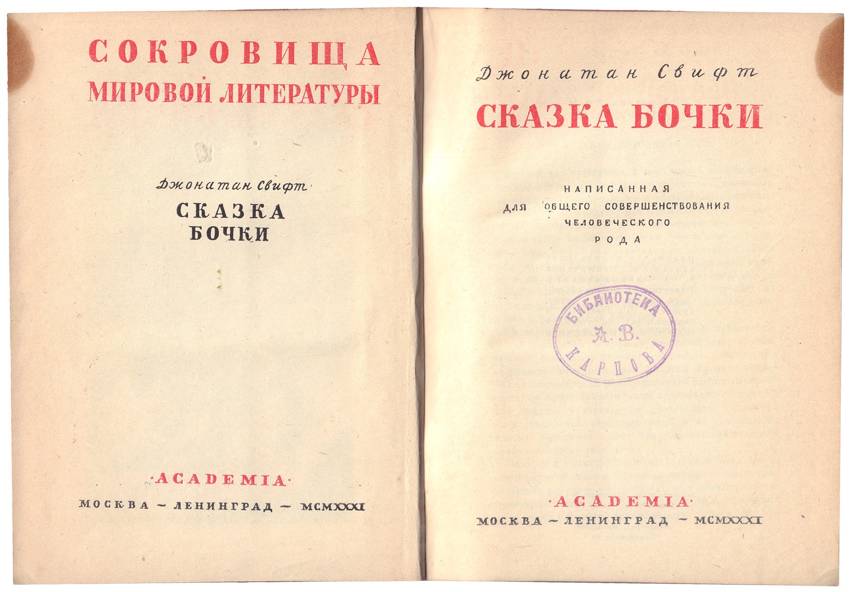 Влад. штемп. экслибрис «Библиотека А.В. Карпова» на своб. л. форз., тит. л., с. 144 и 239.