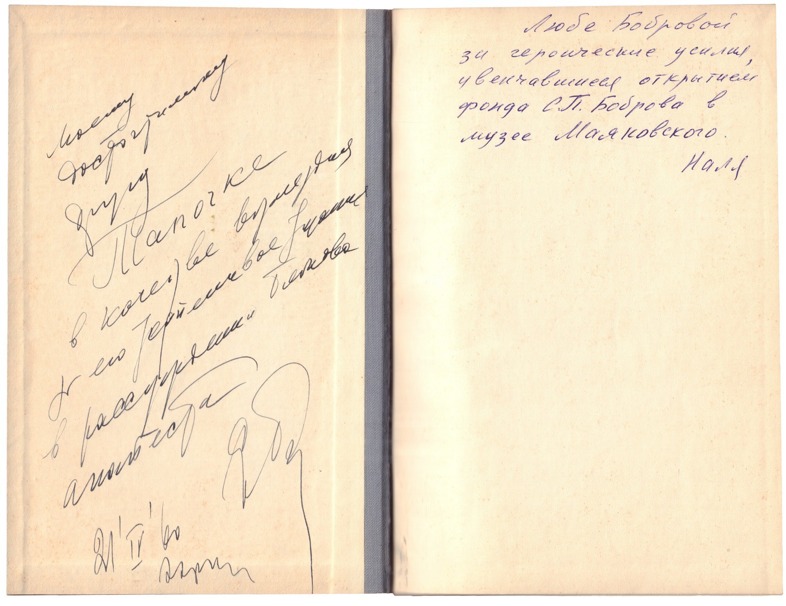 Точечные авторские правки на л. 17, 108, 114 и 137, мелкие редакторские правки разными чернилами по опечаткам на некоторых лл. Собственноручная дарственная надпись Сергея Павловича Боброва на л. форз.: «Моему / досточтимому / другу / Тапочке / в качестве возмездия / за его терпеливое тщание / в рассуждении <?> / анапеста / 21/IV/'60». Дарственная надпись, адресованная дочери поэта, Любови Сергеевне Бобровой, на своб. л. форз.: «Любе Бобровой за героические усилия, увенчавшиеся открытием фонда С.П. Боброва в музее Маяковского / Наля».