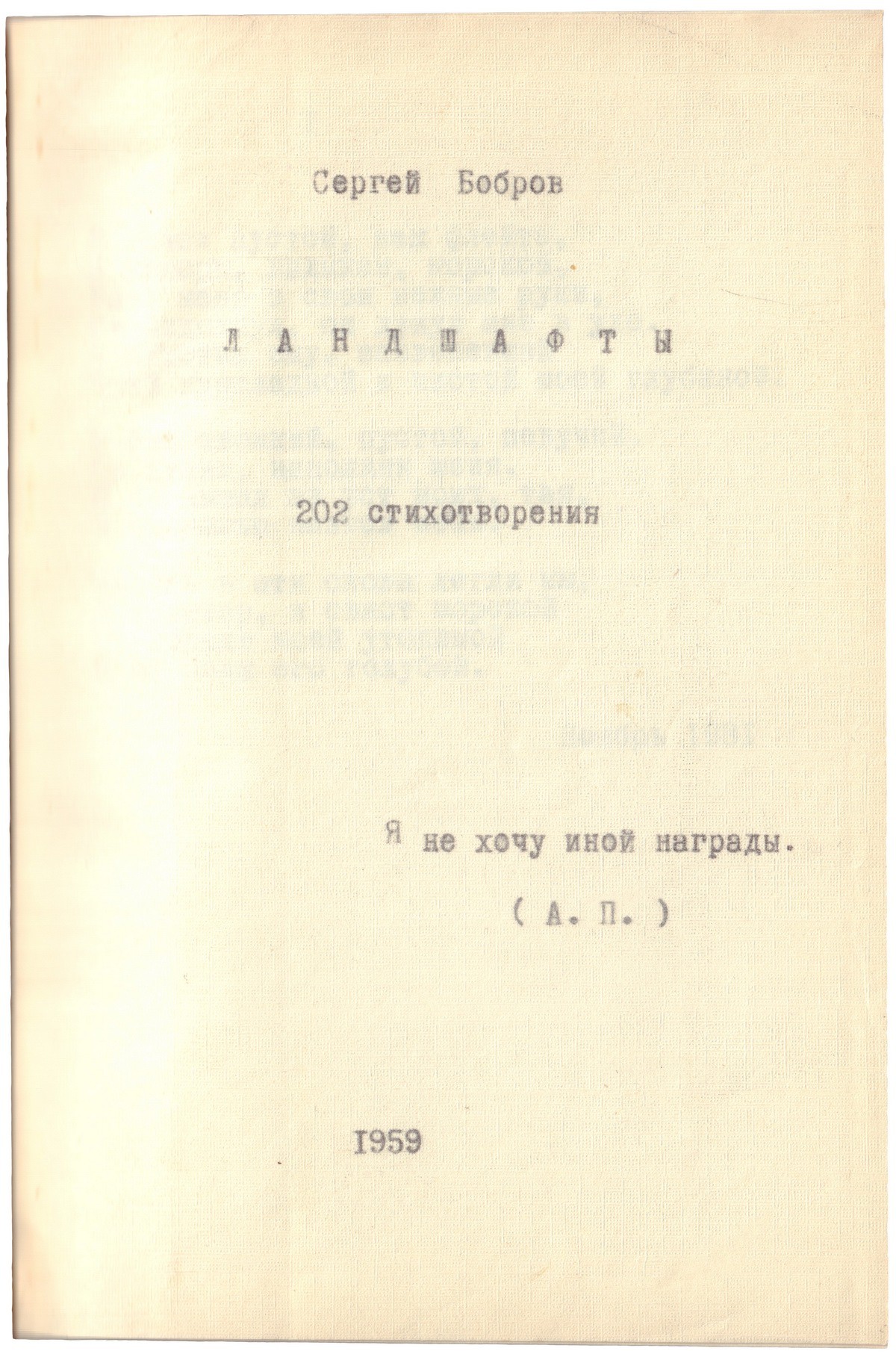 Сергей Павлович Бобров (1889-1971) — русский поэт, литературный критик, переводчик, художник, математик и стиховед, один из организаторов русского футуризма, популяризатор науки. В 1913 году возглавлял постсимволистскую группу «Лирика», с 1914 года — группу футуристов «Центрифуга»; его ближайшие литературные сподвижники — Борис Пастернак, Николай Асеев и Иван Аксёнов. Пользуясь девятью псевдонимами, он заполнил около трети антологии «Второй сборник Центрифуги» (1916) своими стихами. За три предреволюционных года издательство «Центрифуга» под руководством Боброва выпустило полтора десятка книг, включая «Поверх барьеров» Пастернака и несколько сборников Асеева. Бобров активно выступал как теоретик своих групп и критик-полемист (в 1920-е — в журнале «Печать и революция» под разными псевдонимами), тон его выступлений был обычно чрезвычайно резок. В литературных кругах сложился ряд мифов, кочующих по мемуарным публикациям и делающих фигуру Боброва одиозной: якобы он до революции был черносотенцем, а после неё — чекистом; якобы во время выступления Александра Блока незадолго до его смерти он крикнул, что тот «уже мертвец», и т. п. После революции Сергей Павлович Бобров не выпустил ни одного сборника своих стихов, хотя писал их на протяжении всей жизни. В 1920—1930-е годы работал в Центральном статистическом управлении. Был репрессирован, сослан в Кокчетав. «Ландшафты» — сборник стихотворений, написанных поэтом с 1916 по 1950е годы. Также включены «Глоссарий к словам Гёте» (1937), «Подражания старинной музе росской» (1944-1945), переводы из Камоэнса, Шелли, Элюара, китайских поэтов и др.