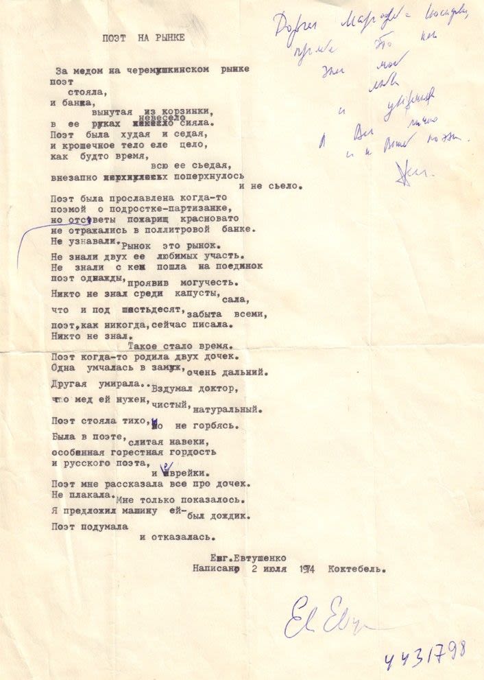 Машинопис. экз. стихотворения Евгения Евтушенко, посвященного Маргарите Алигер, с его дарственной надписью: “Дорогой Маргарите Иосифовне / примите это как знак моей любви и уважения / к Вам лично и к Вашей поэзии / Женя”. Поэт на рынке За медом на черемушкинском рынке поэт стояла и банка, вынутая из корзинки, в ее руках невесело сияла. Поэт была худая и седая, И крошечное тело еле цело, Как будто время, всю ее съедая, внезапно поперхнулось и не съело. <...> Поэт мне рассказала все про дочек. Не плакала. Мне только показалось. Я предложил машину ей – был дождик. Поэт подумала и отказалась. Евг. Евтушенко. Написано 2 июля 1974 Коктебель. В 1974 году покончила с собой малдшая дочь Алигер Татьяна Макарова.