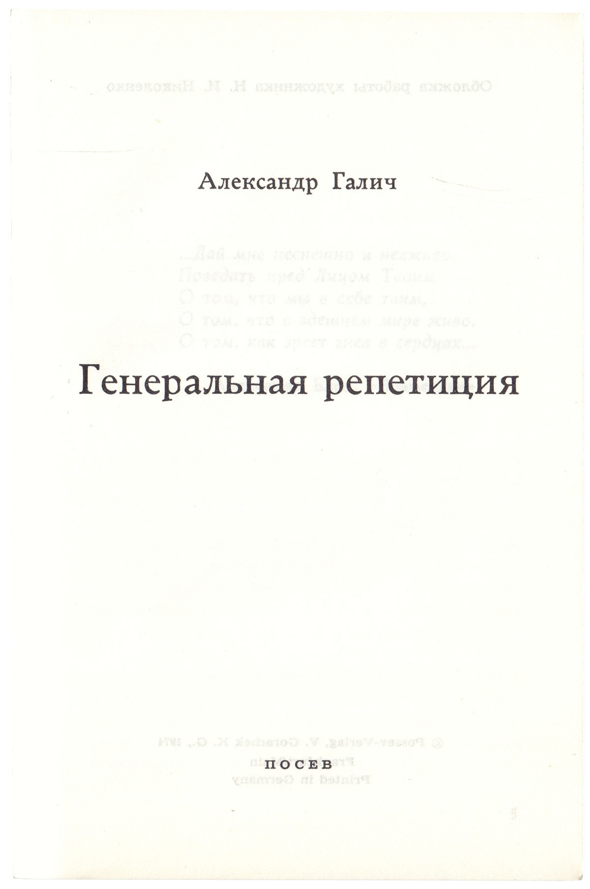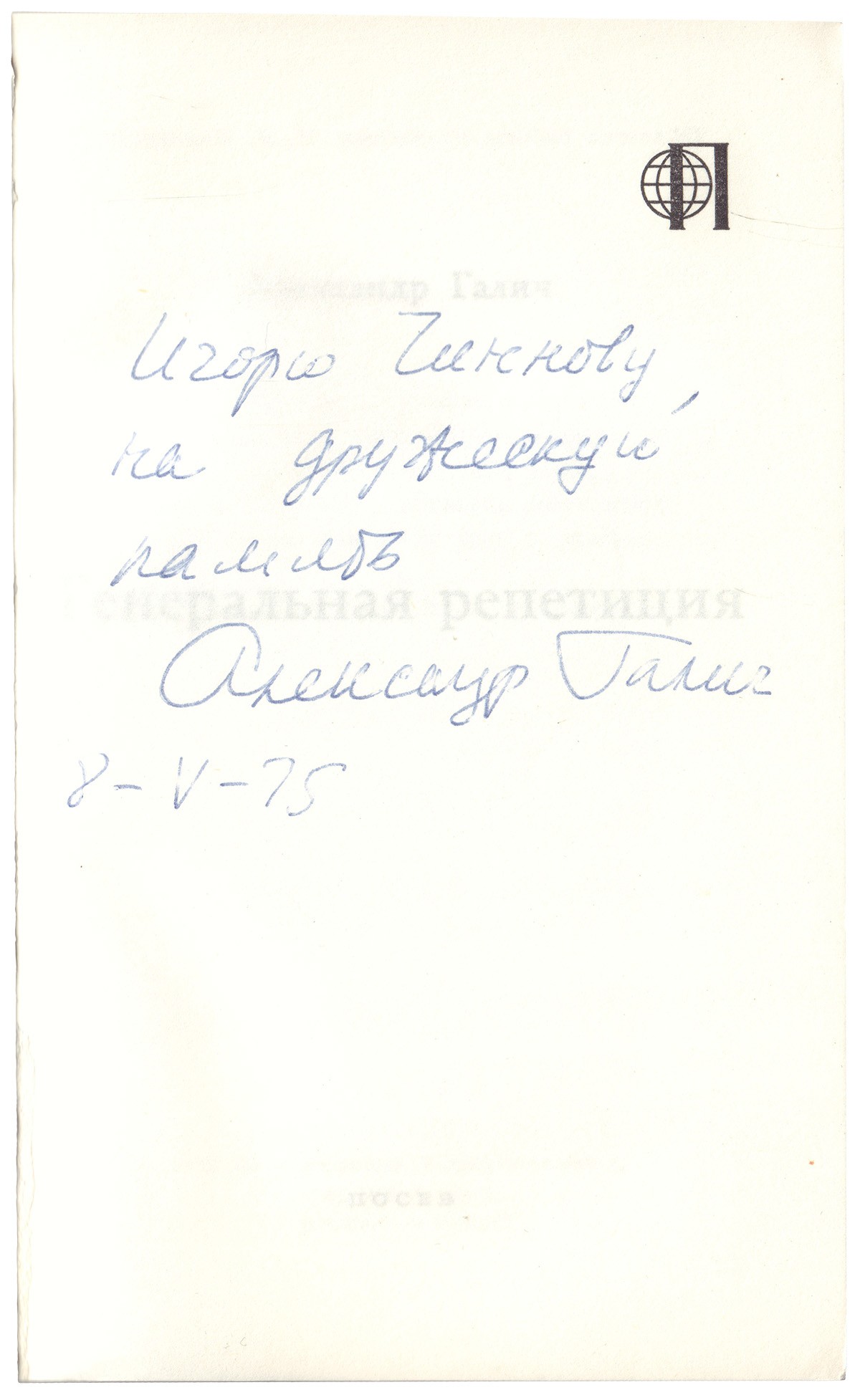 На авантитуле дарственная надпись автора: "Игорю Чиннову, / на дружескую / память / Александр Галич / 8-V-75".