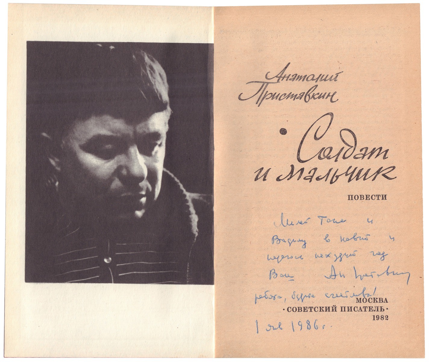 На тит.л. дарственная надпись, адресованная Т. Щербине и ее мужу : "Милой Тане и / Вадиму в Новый и / надеюсь нехудший год. / Ваш Ан. Приставкин / Ребята, будьте счастливы! / 1 янв. 1986 г.". Из архива Татьяны Щербины.