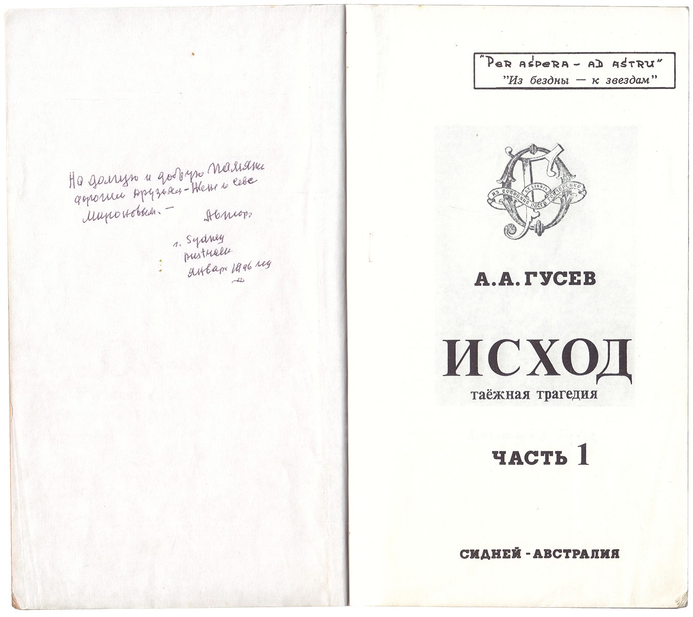 На форзаце дарственная надпись А.А. Гусева: "На долгую и добрую память дорогим друзьям - Жене и Севе Мироновым - Автор. г. Sydney 1994".