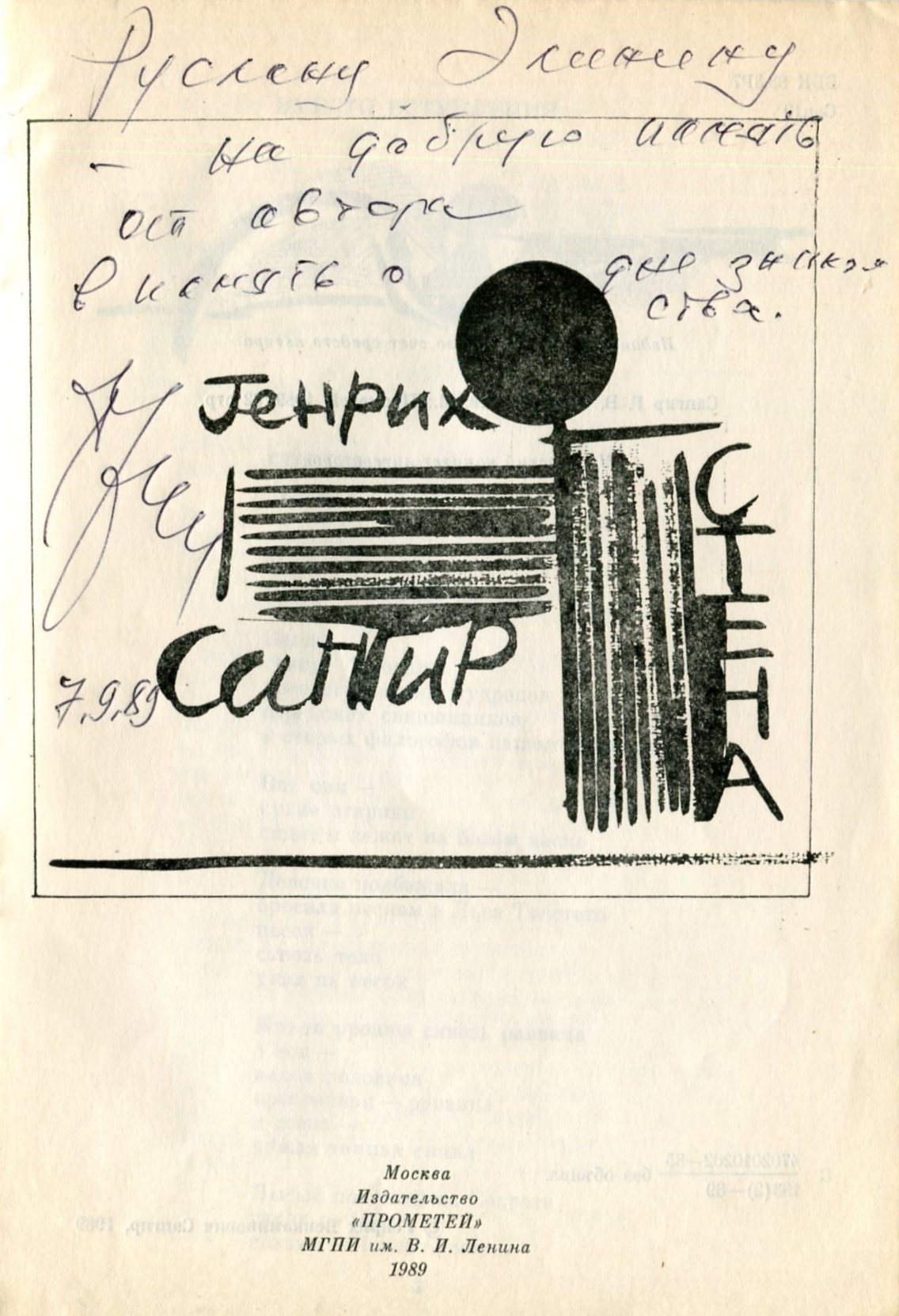 На тит. л. дарственная надпись автора: "Руслану Элинину - на добрую память от автора , в память о дне знакомства. Г.Сапгир. 7.9.89".