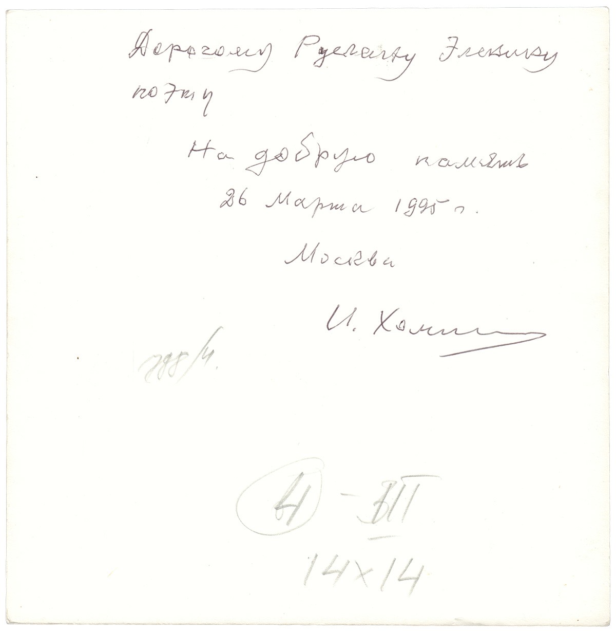 На обороте дарственная надпись Игоря Холина: "Дорогому Руслану Элинину / поэту / На добрую память / 26 марта 1995 г. / Москва / И. Холин".