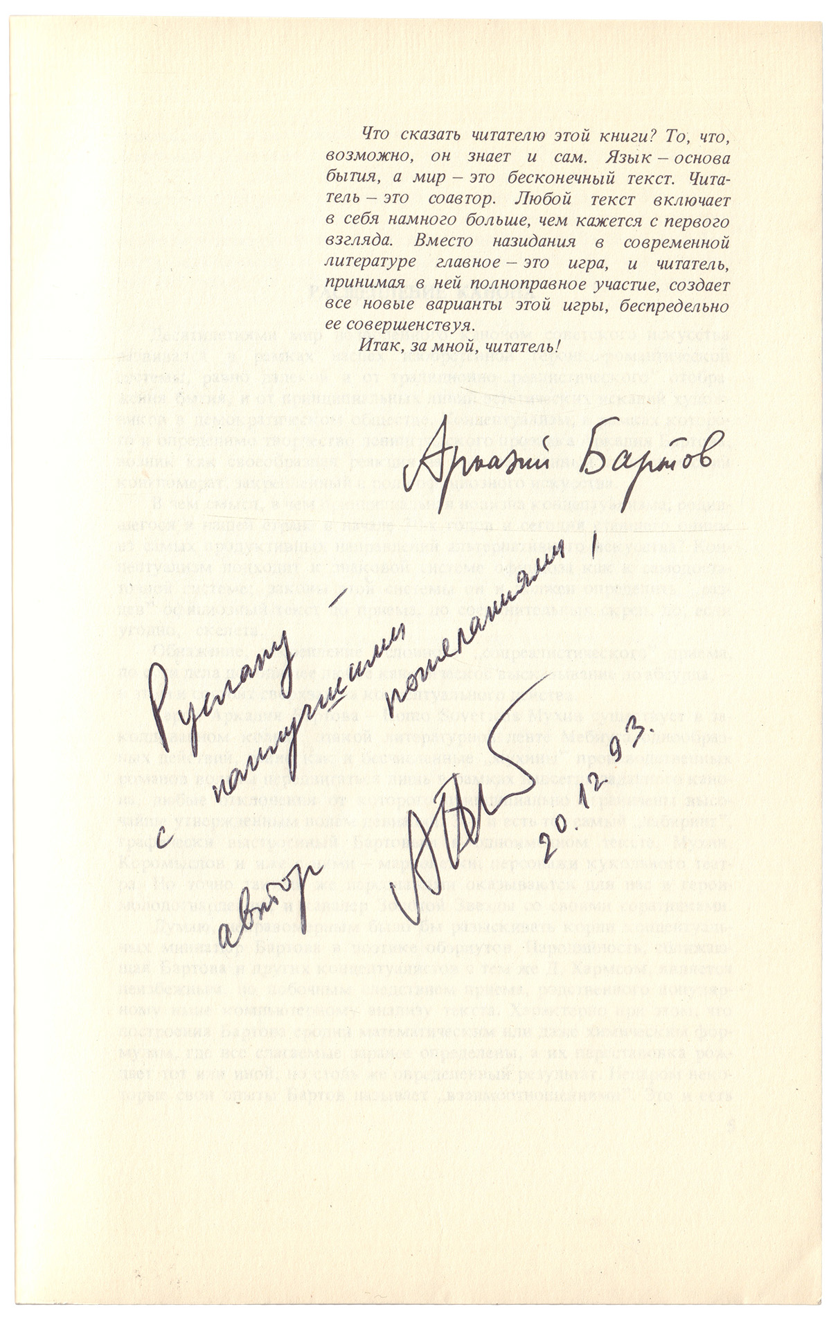 На л. с эпиграфом дарственная надпись автора, адресованная Р. Элинину: " Аркадий Бартов / Руслану - с наилучшими пожуланиями, автор 20.12.93".
