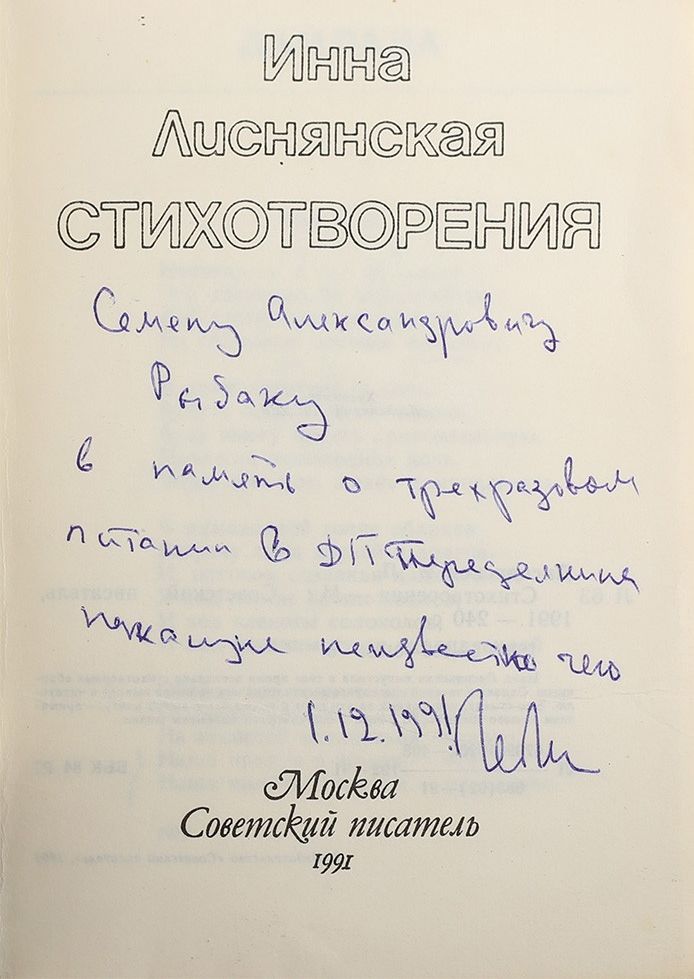 На тит.л. дарственная надпись автора: «Семену Александровичу / Рыбаку / в память о трехразовом / питании в ДТ Переделкина / накануне неизвестно чего / 1.12. 1991 / ИЛисн».