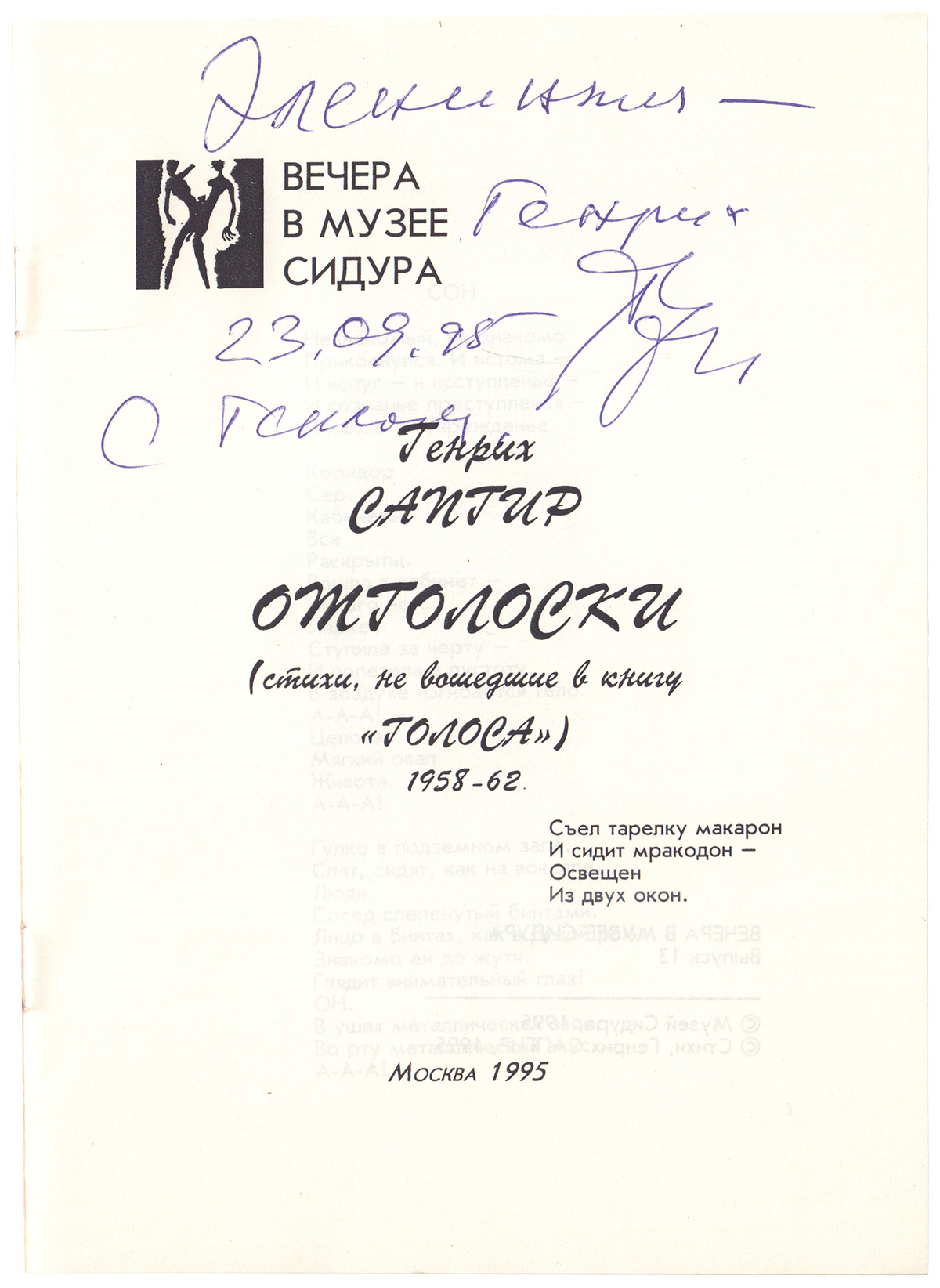 На тит. л. дарственная надпись автора: "Элининым - Генрих / 23.09.95. / С теплом". Из архива издательства Руслана Элинина.