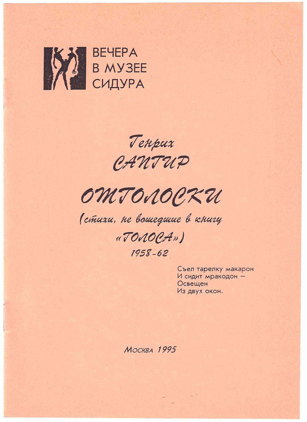 Генрих Вениаминович Сапгир (1928-1999) — поэт, прозаик, сценарист, переводчик. Один из создателей (вместе с И. Холиным) так называемой «барачной поэзии». С середины 1960-х годов публиковался на Западе. Известен в СССР как детский поэт, драматург и сценарист. Участник альманаха «Метрополь», составитель поэтического раздела антологии «Самиздат века».