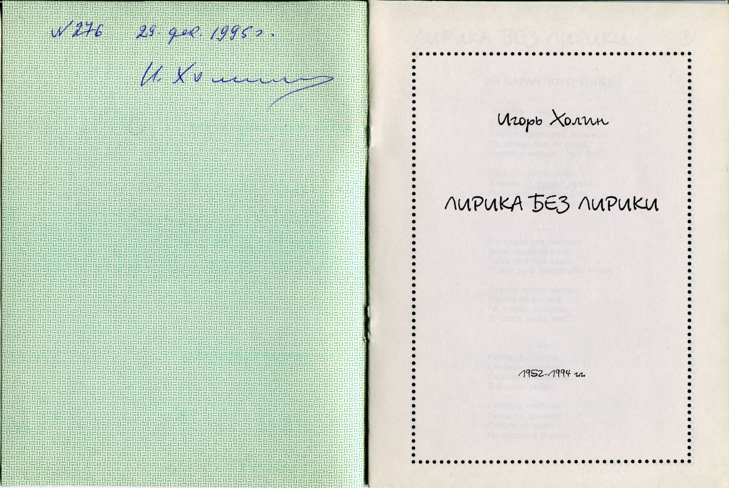 . На обороте обложки надпись автора "№ 296. 29 дек. 1995 г. И. Холин" . Из архива издательства Руслана Элинина.